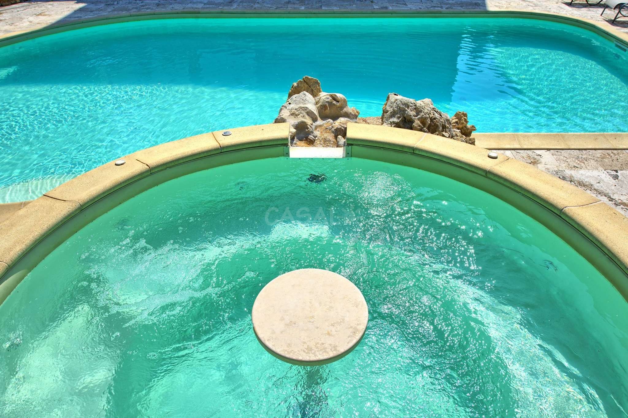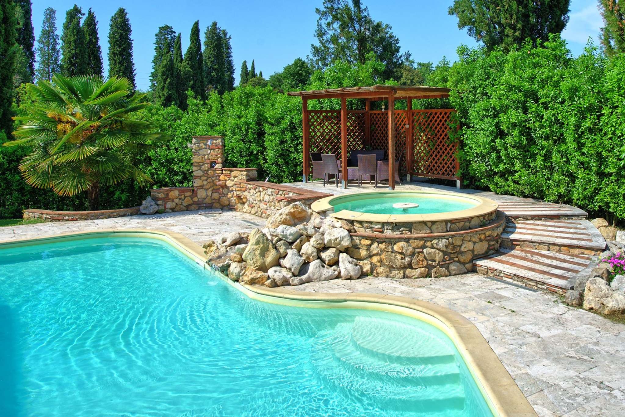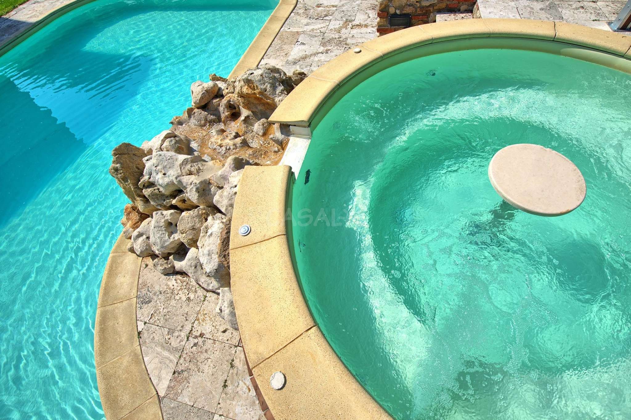 Zusätzlich zu dem großen Pool (ca. 13 x 8 m bei einer Mindesttiefe von 1,20 m, und einer maximalen Tiefe von 1,80 m) steht auch noch ein Whirlpool zur Verfügung.