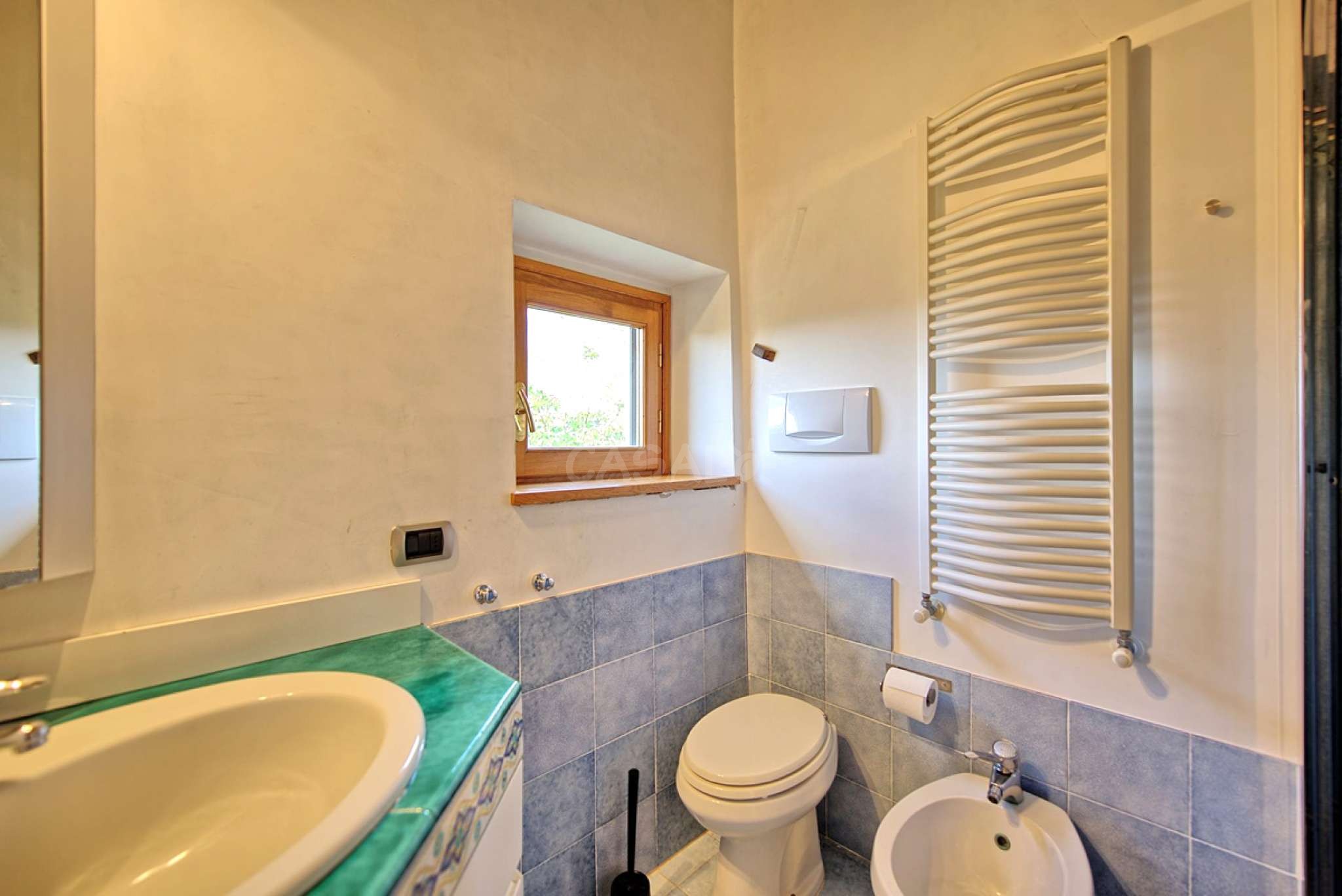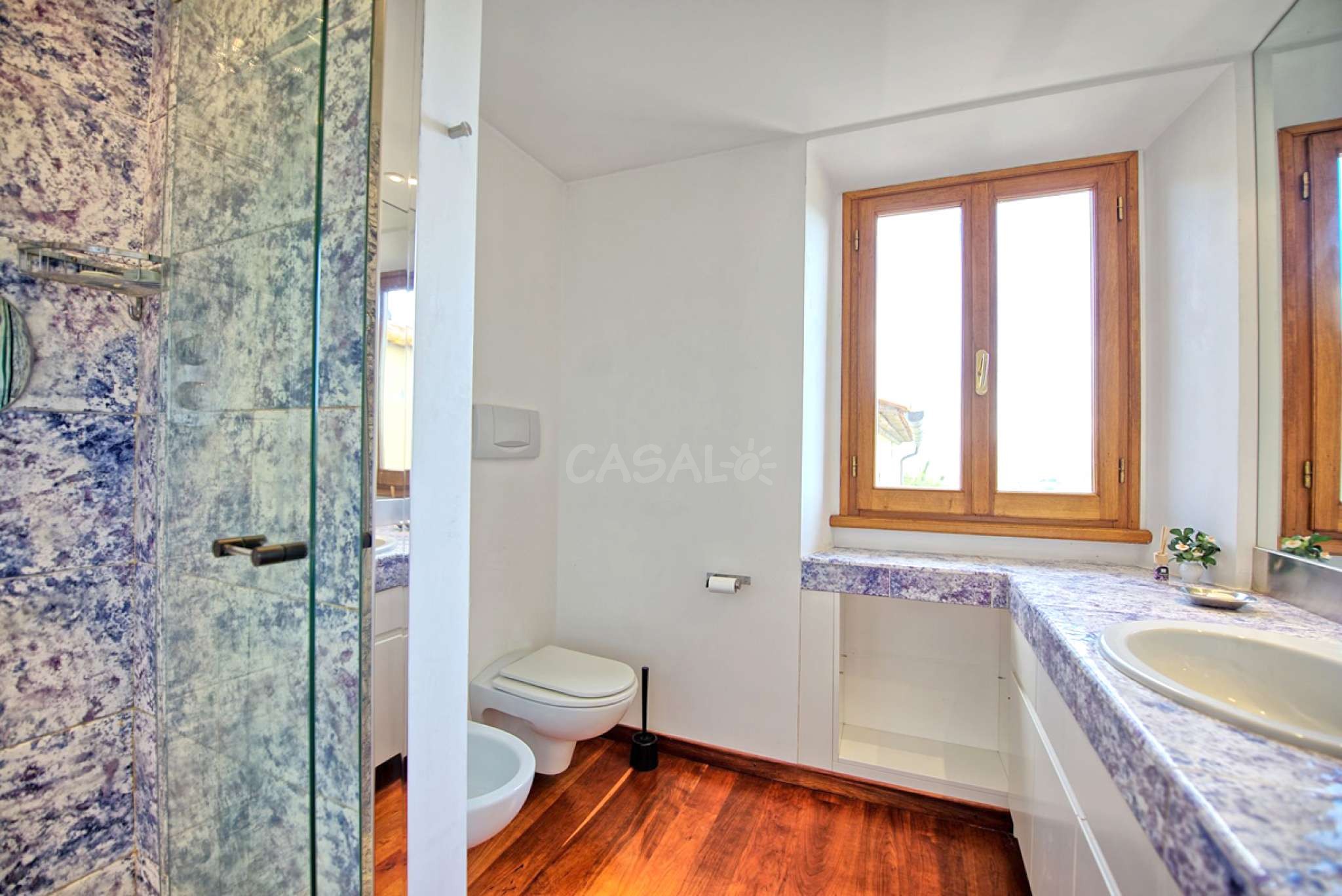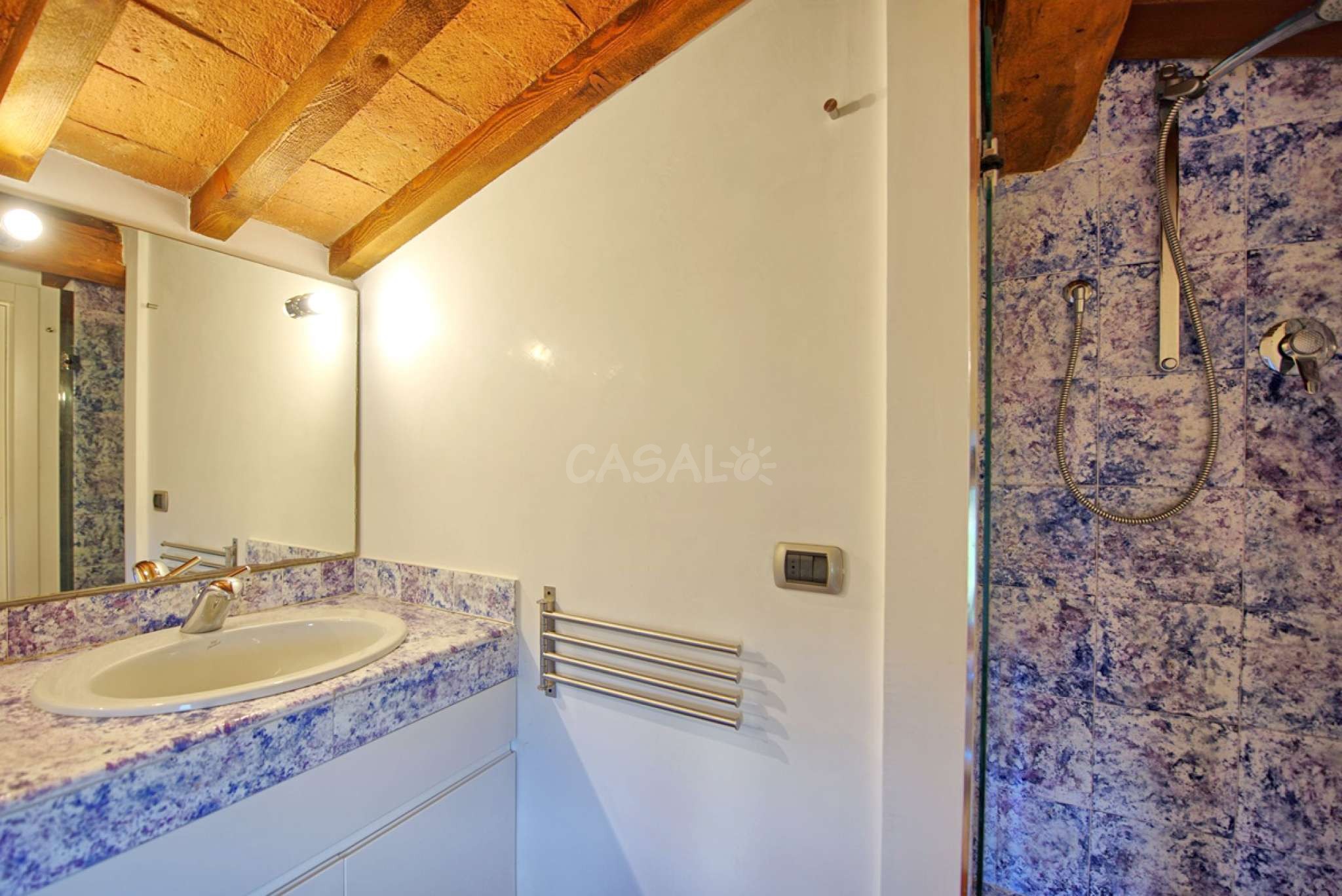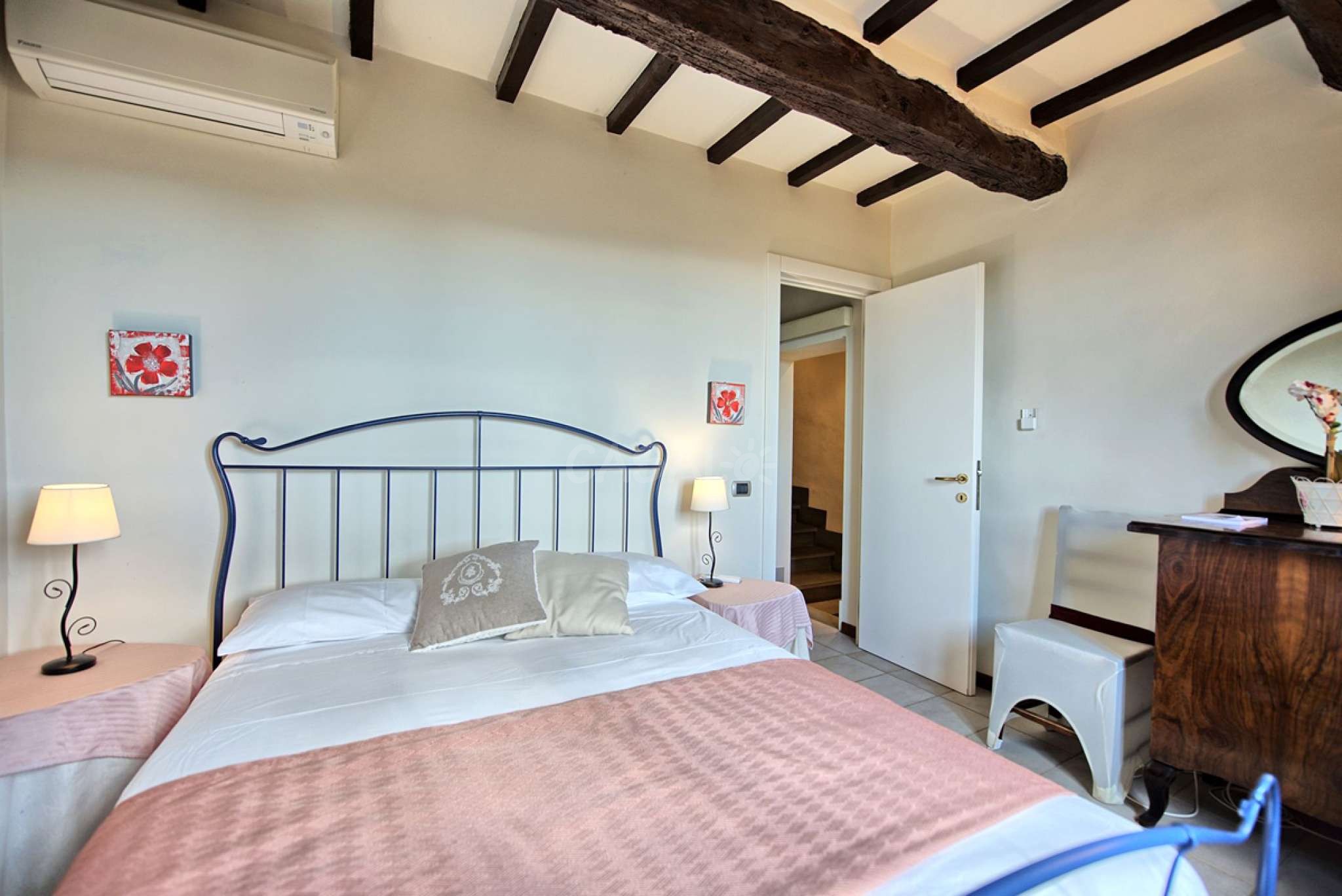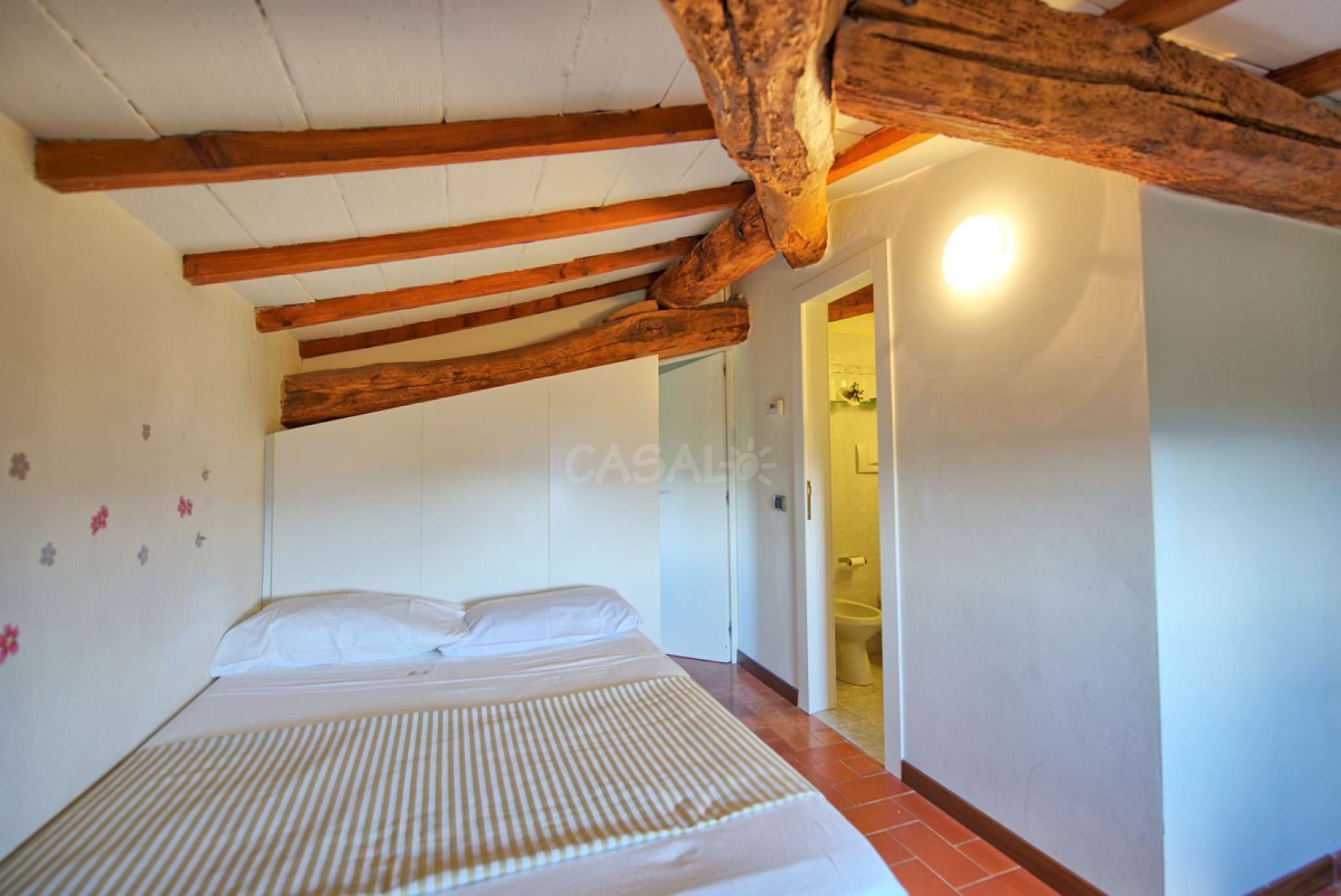 7 Stufen höher (vom 2. Stock aus): Doppelzimmer mit Ehebett und privatem Bad mit Dusche.