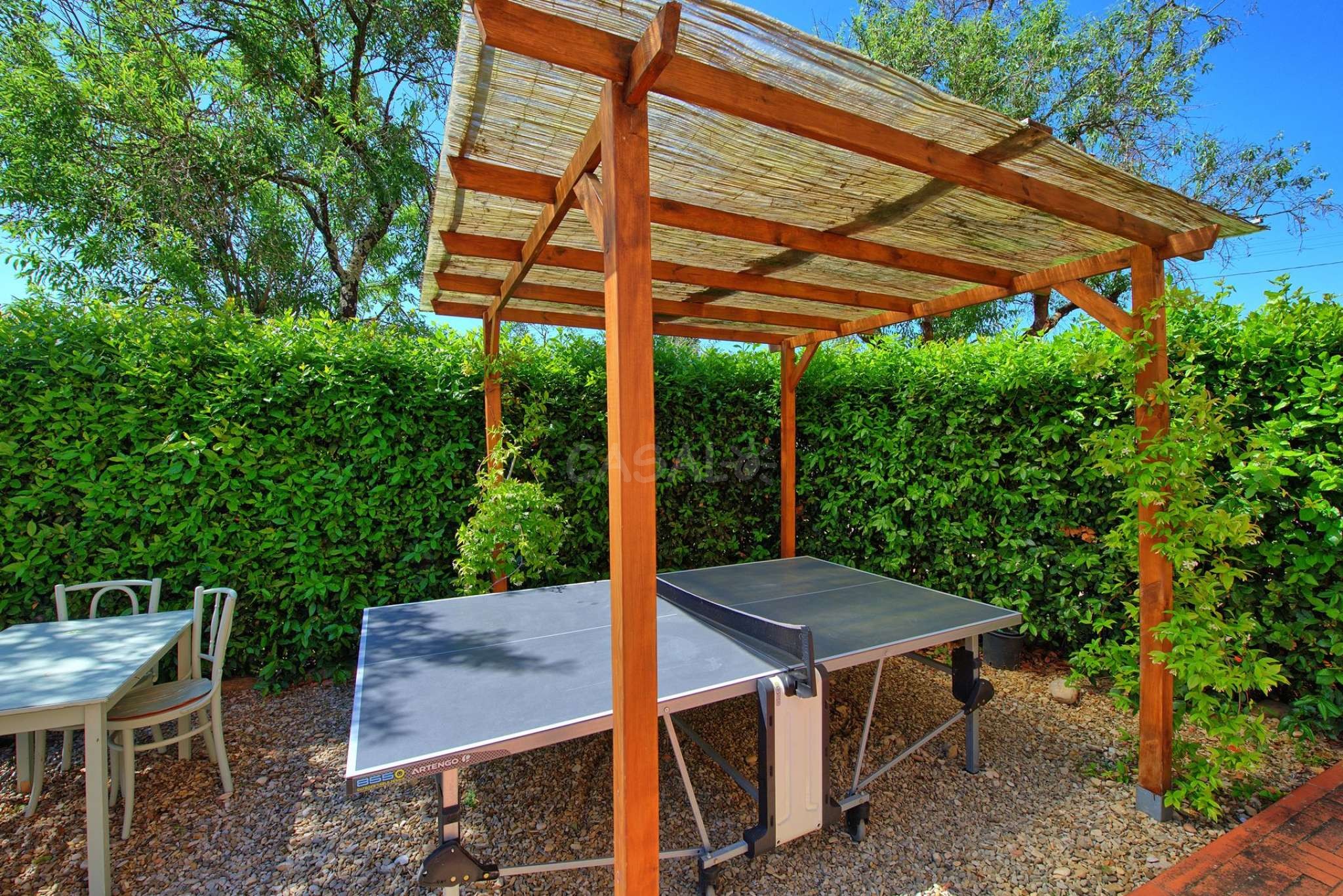 Die Terrasse verfügt über eine Tischtennisplatte, aber auch Tisch und Stühle stehen zur Verwendung bereit.