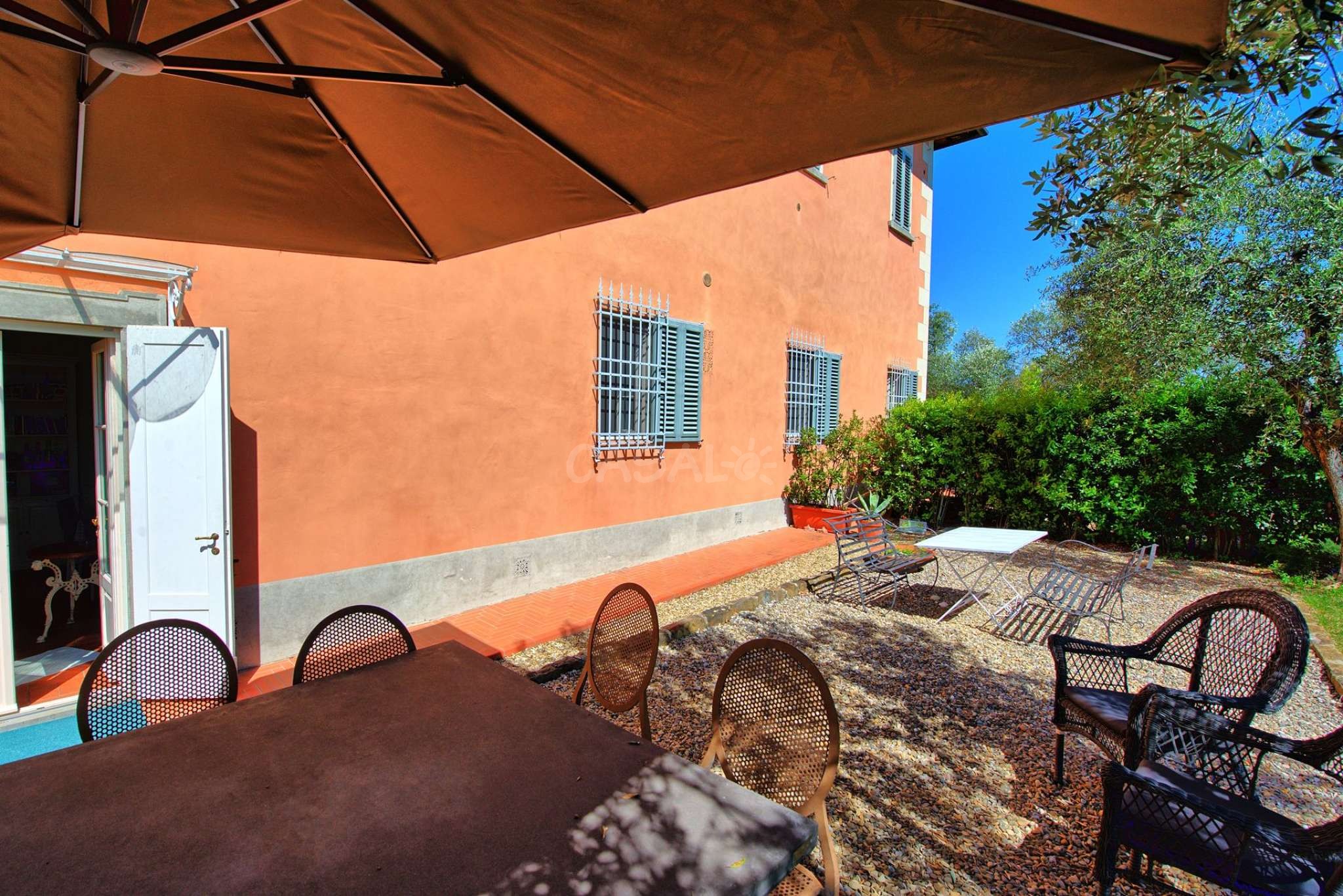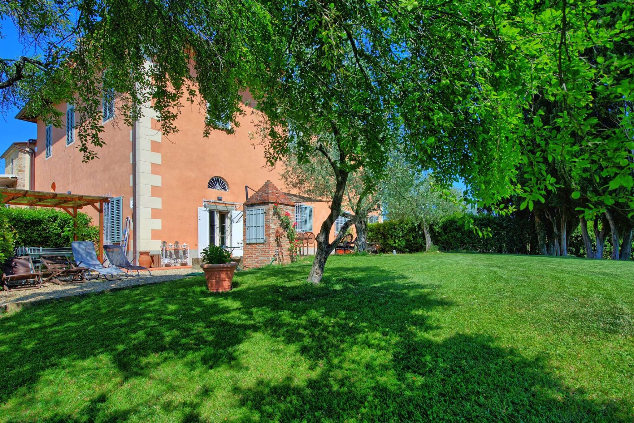 Der große Garten verfügt über viele schattenspendende Bäume.