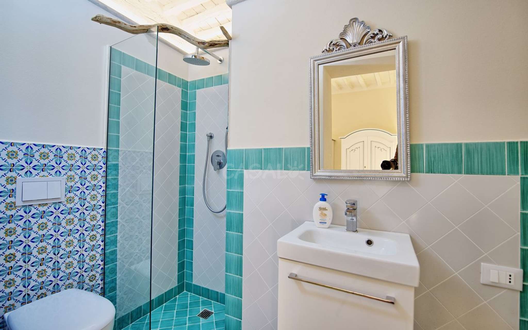 8 Stufen höher: Doppelzimmer mit Ehebett und privatem Bad mit Dusche, kleine Terrasse.