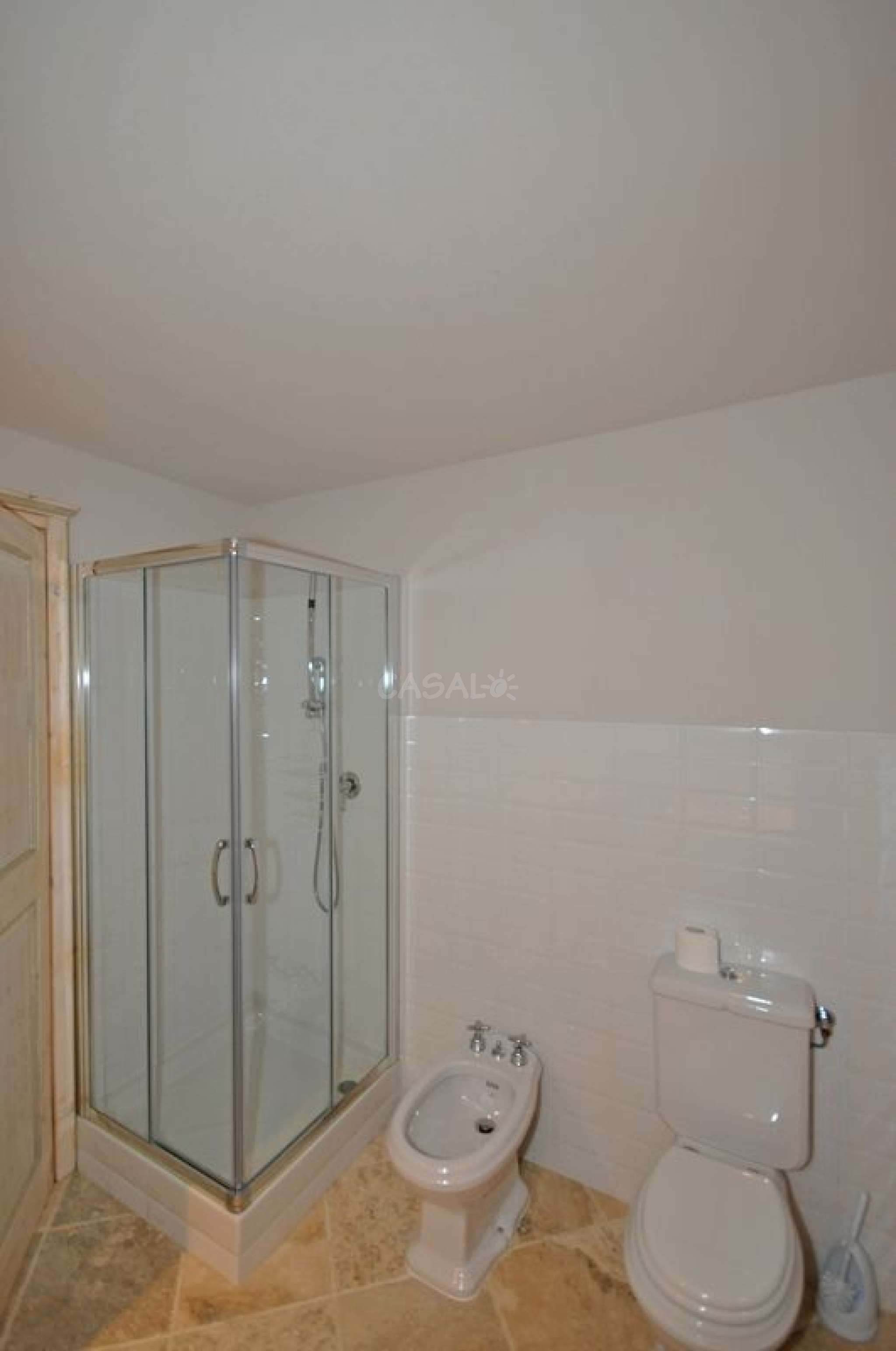 Erdgeschoss Eingang vom Garten über eine überdachte und ausgestattete Terrasse, Wohnzimmer mit Kamin, Küche (Ofen, Tiefkühlfach, Waschmaschine), Bad mit Dusche.
