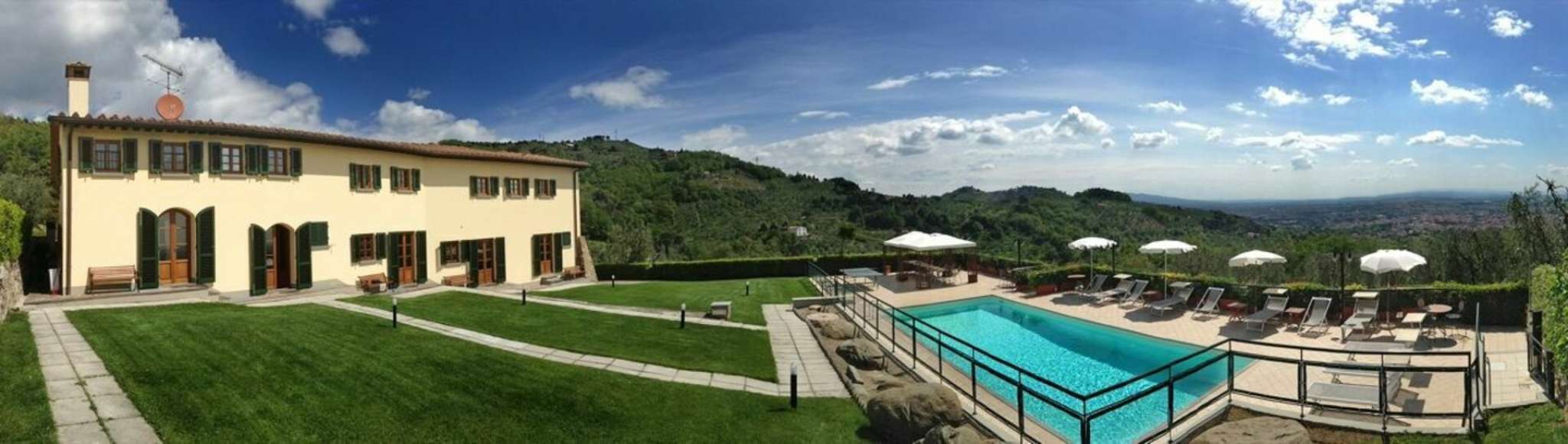 Die Aussicht ist wunderschön. Um die Villa befinden sich: Schwimmbad mit Tischen, Stühlen, Sonnenschirmen, Liegestühlen; der beleuchtete Garten und die Terrasse; Barbecue; Holzofen; Kinderspielplatz; großer Parkplatz; Tischtennis; Mountain Bike Pfade; Waschküche; Umkleideraum des Schwimmbades; Abstellräume.
