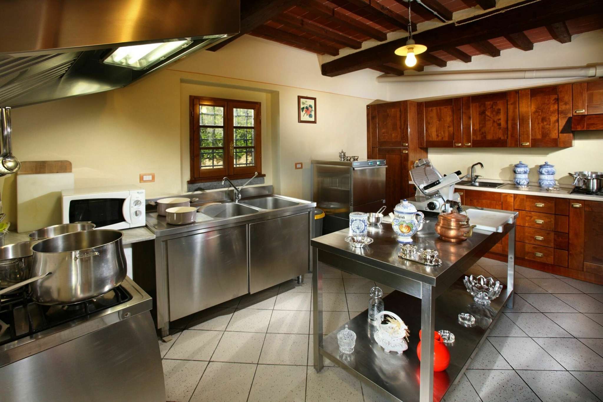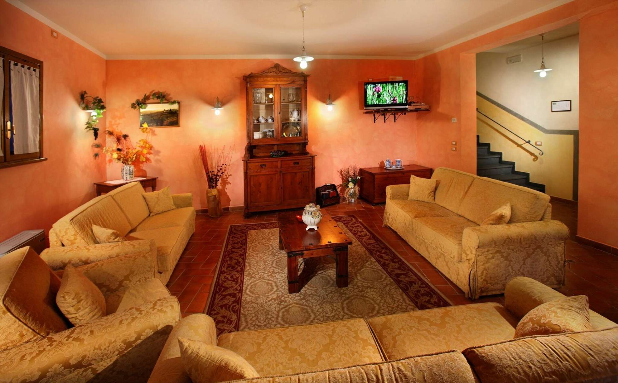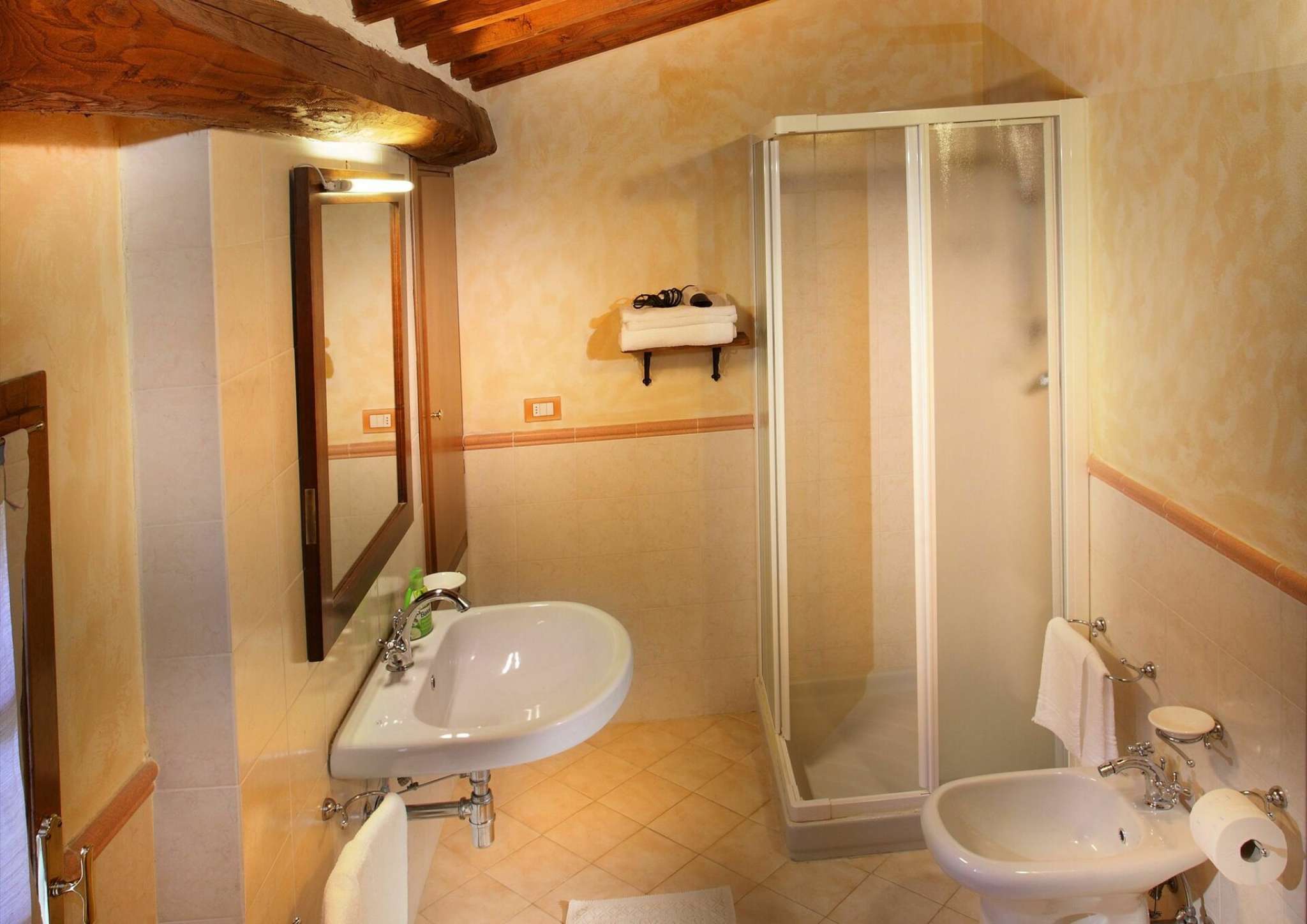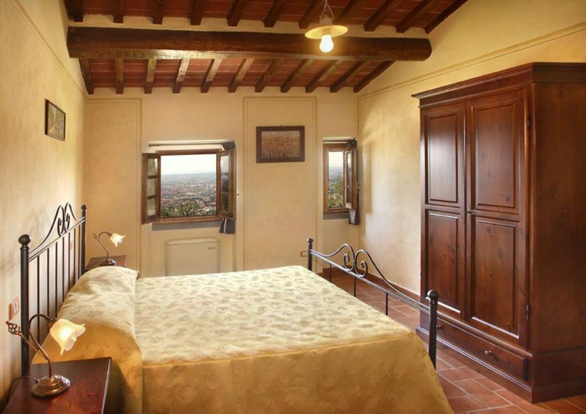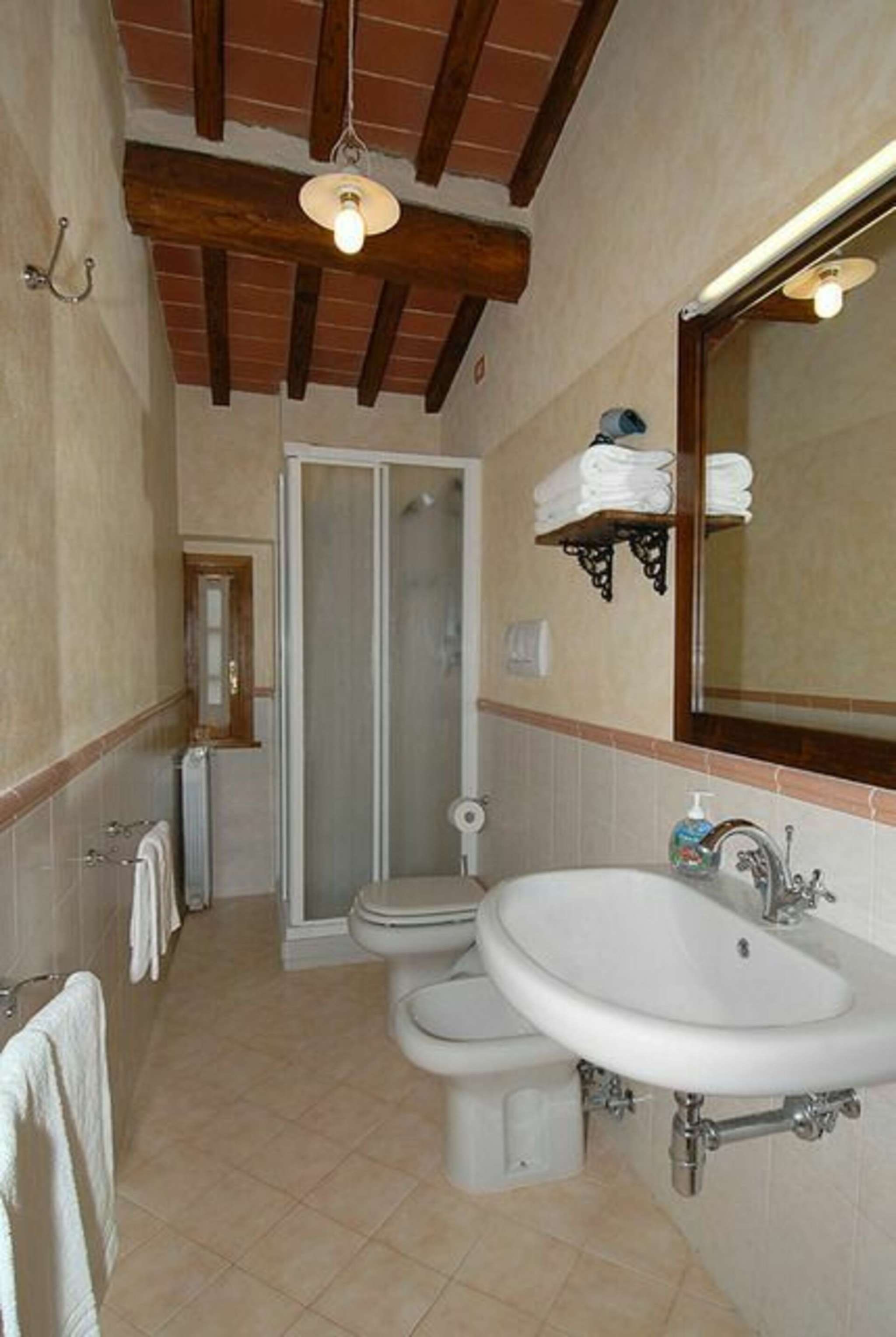 Im Erdgeschoss befinden sich: Esssaal mit Sat-TV, Stereoanlage, Internetanschluss; Bar; Küche mit zwei Herden (einem davon semi-professionell mit 9 Kochern), 2 Kühlschränken, 2 Öfen, 2 Geschirrspülern, Mikrowelle, Toaster, Wurstschneidemaschine, usw; 5 Zimmer mit Bad: 3 Doppel- (2 mit eigenem Eingang) und 2 Einzelzimmer (beide mit Ehebett). Im ersten Stock befinden sich: 7 Zimmer mit Bad: 5 Doppel- (3 mit Ehebett und 2 mit zwei Einzelbetten) und 2 Einzelzimmer (1 mit zwei Einzelbetten und 1 mit Ehebett); ein Abstellraum. Die Zimmer sind im rustikalen, toskanischen Stil eingerichtet und fein dekoriert; mit Klimaanlage und Heizung. Die Bäder haben Dusche/WC, Bidet, Waschbecken, Spiegel, Fenster, Haartrockener.