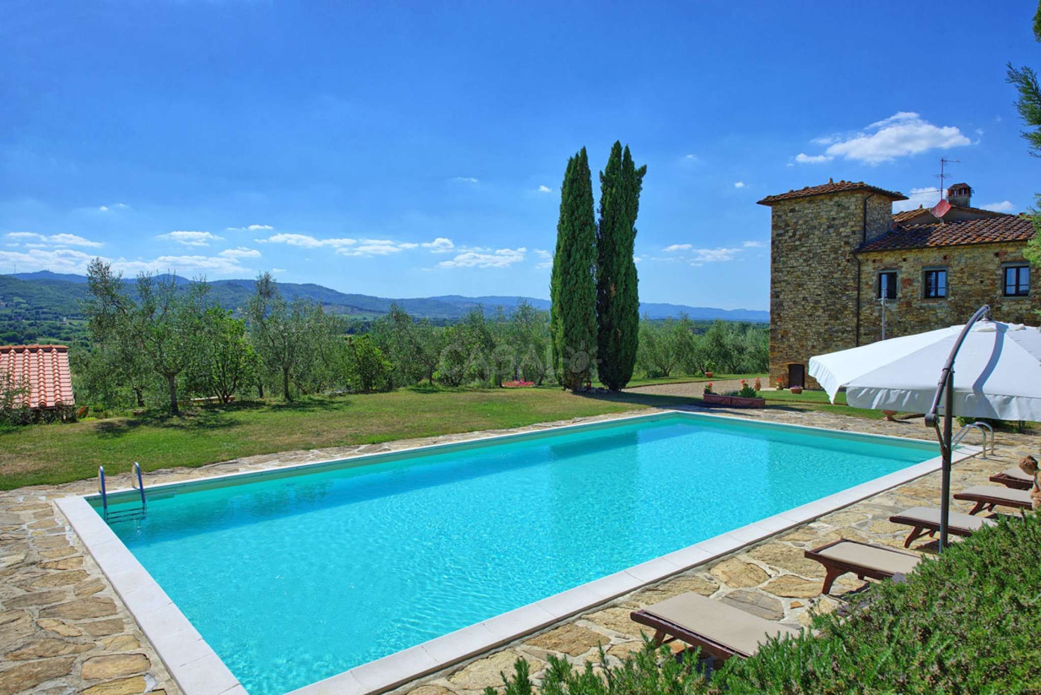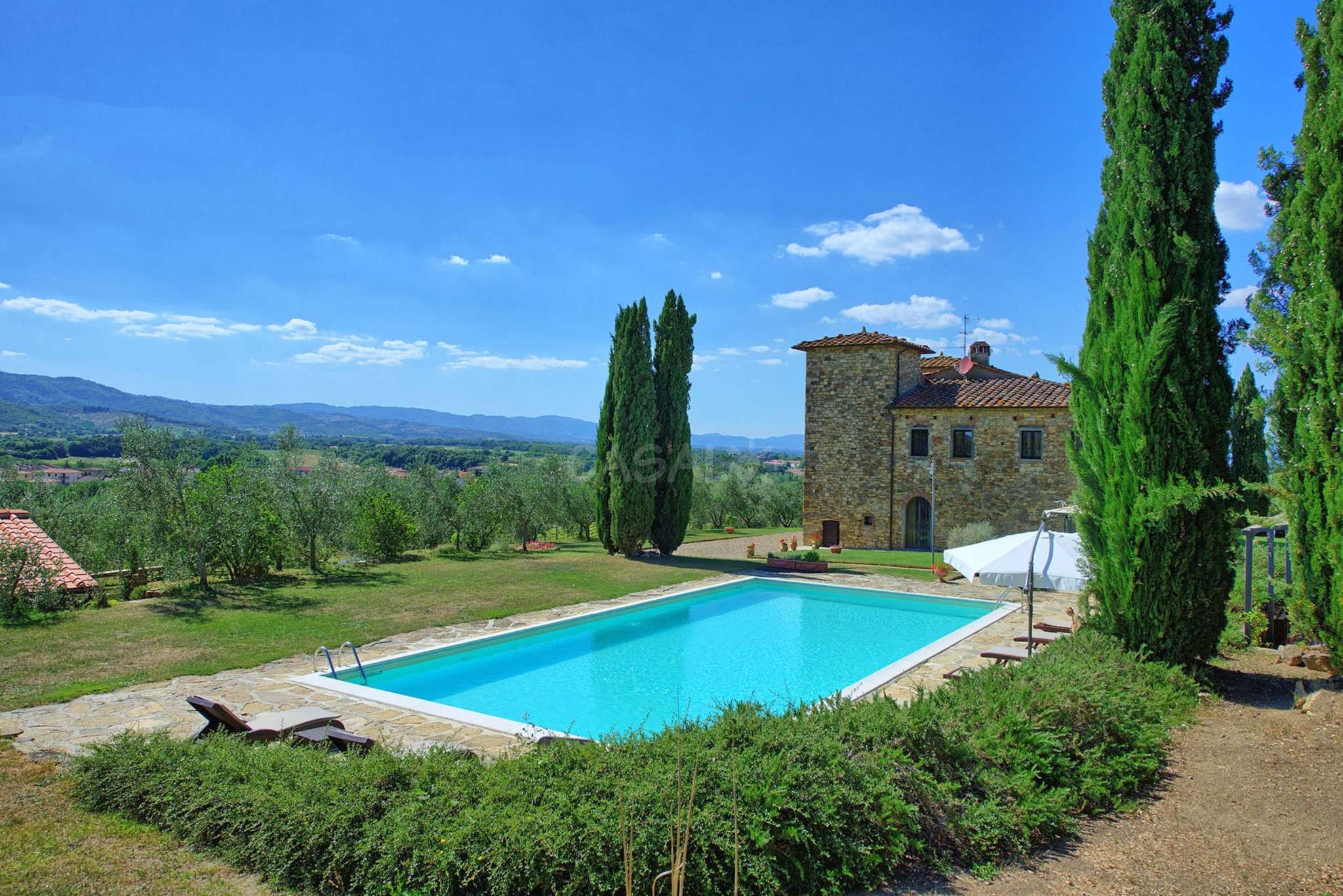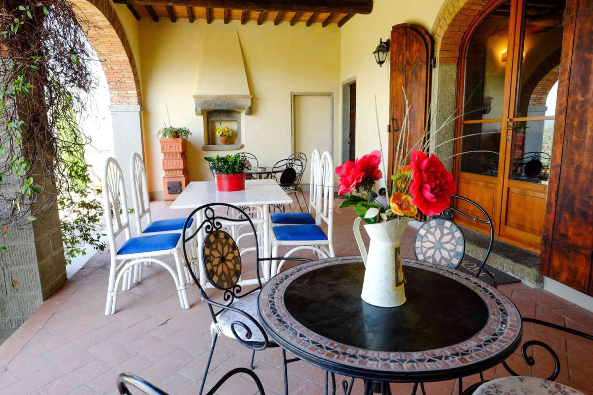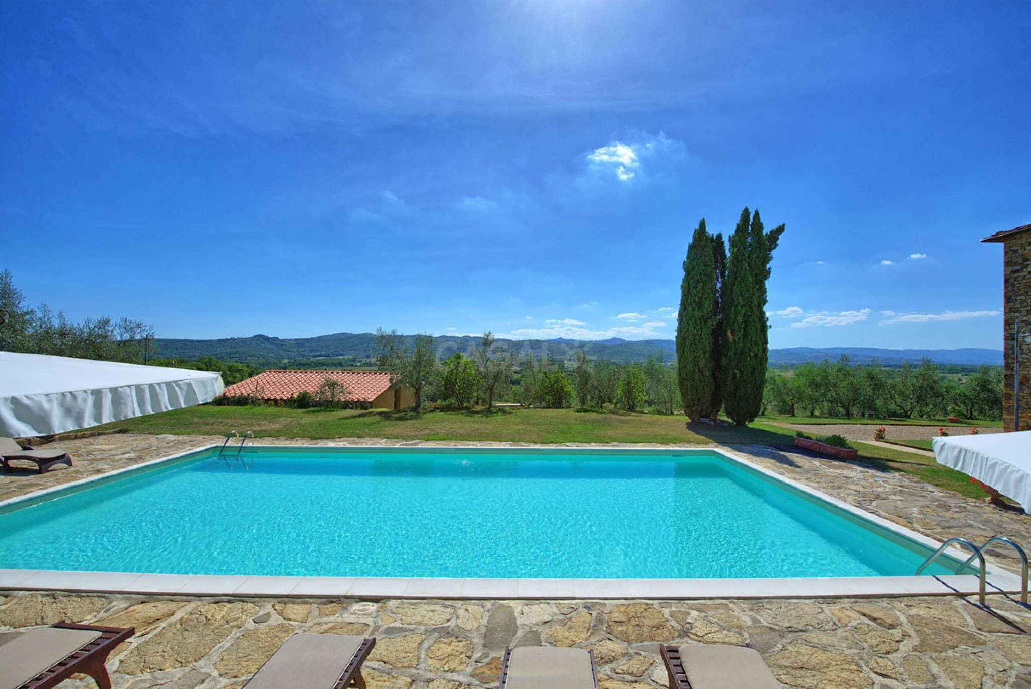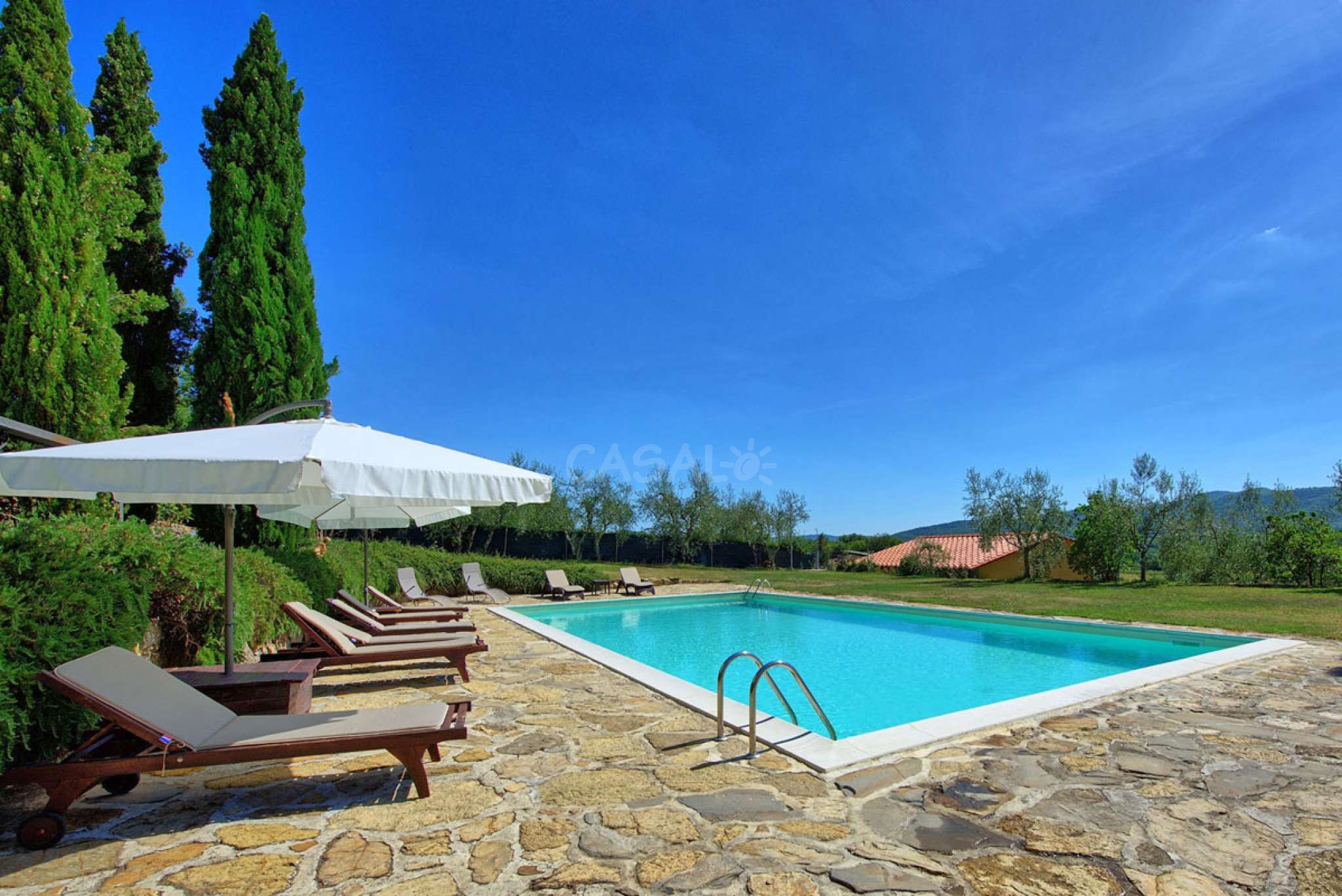 In dem gepflegten, komplett eingezäunten Garten befinden sich ein privater Pool mit Dusche, ein Grill, sowie ein überdachter Freisitz für lauschige Abendessen im Freien. Das Landgut bietet eine große Loggia im Erdgeschoss und eine zweite Loggia im ersten Stock mit fantastischem Panoramablick auf die umliegenden Wälder, das Dorf Bucine mit den ersten Hügeln des Chianti Gebiets am Horizont.