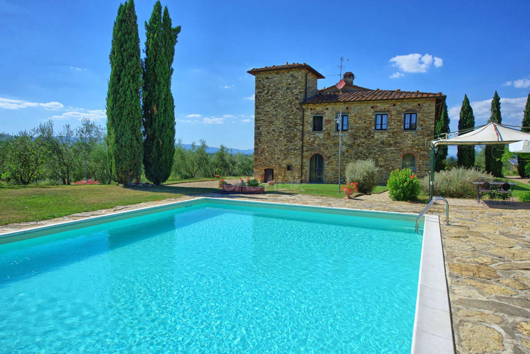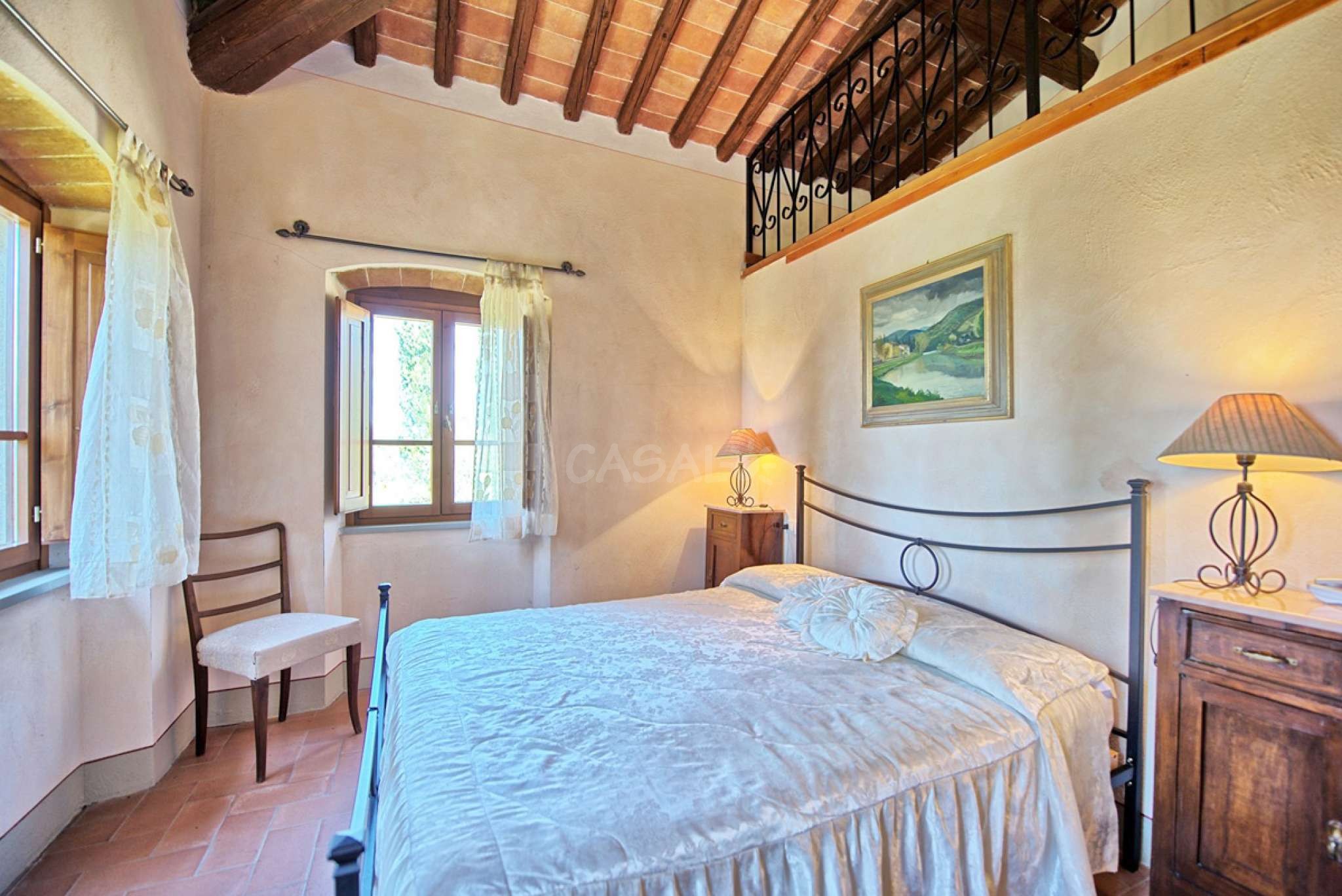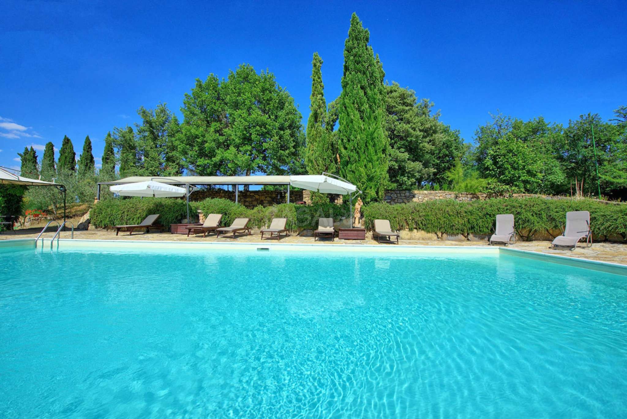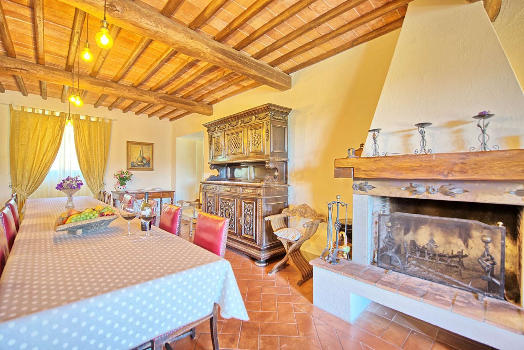 In dem gepflegten, komplett eingezäunten Garten befinden sich ein privater Pool mit Dusche, ein Grill, sowie ein überdachter Freisitz für lauschige Abendessen im Freien. Das Landgut bietet eine große Loggia im Erdgeschoss und eine zweite Loggia im ersten Stock mit fantastischem Panoramablick auf die umliegenden Wälder, das Dorf Bucine mit den ersten Hügeln des Chianti Gebiets am Horizont.