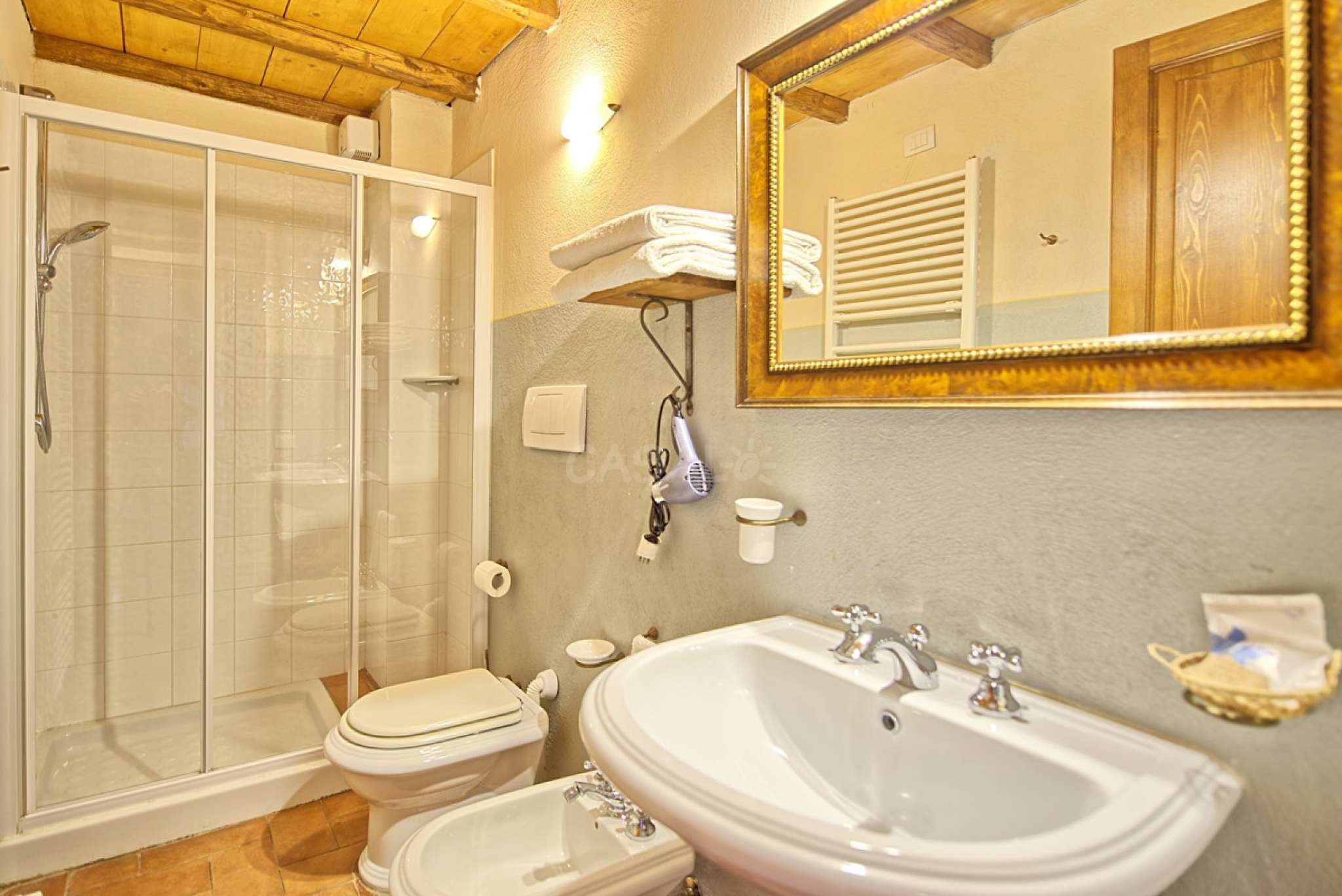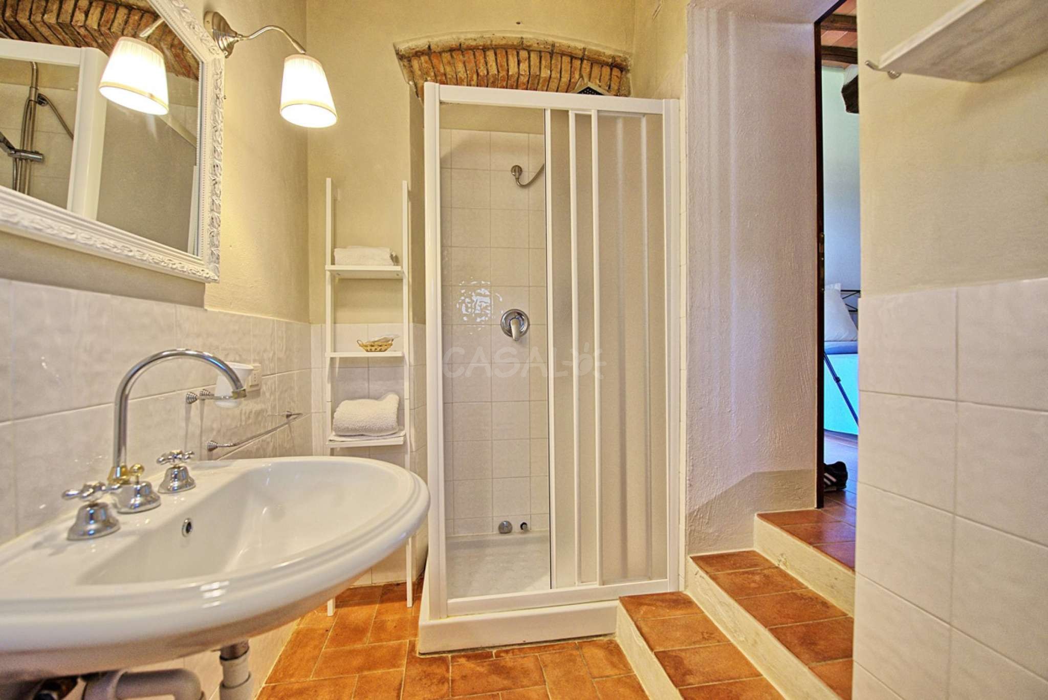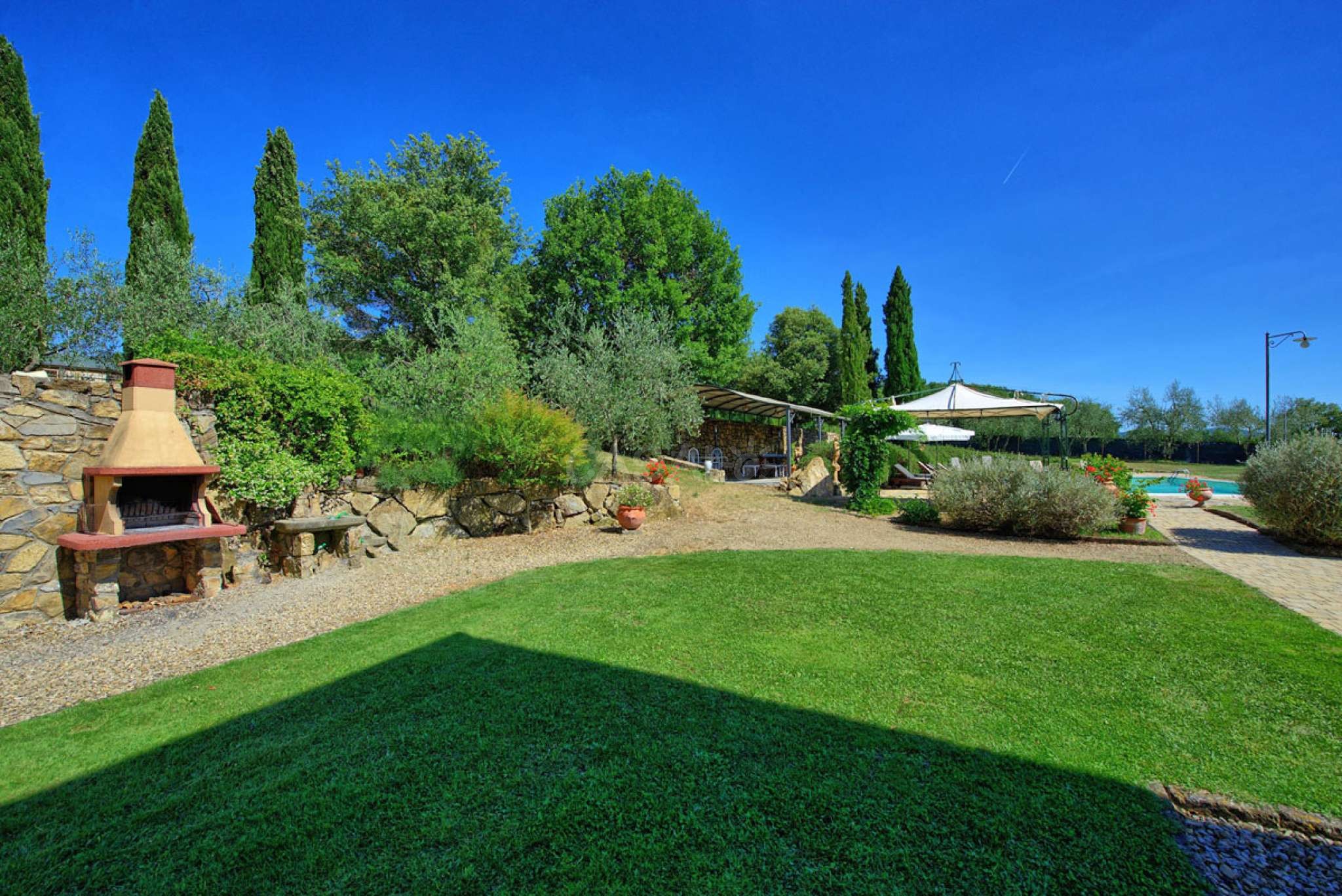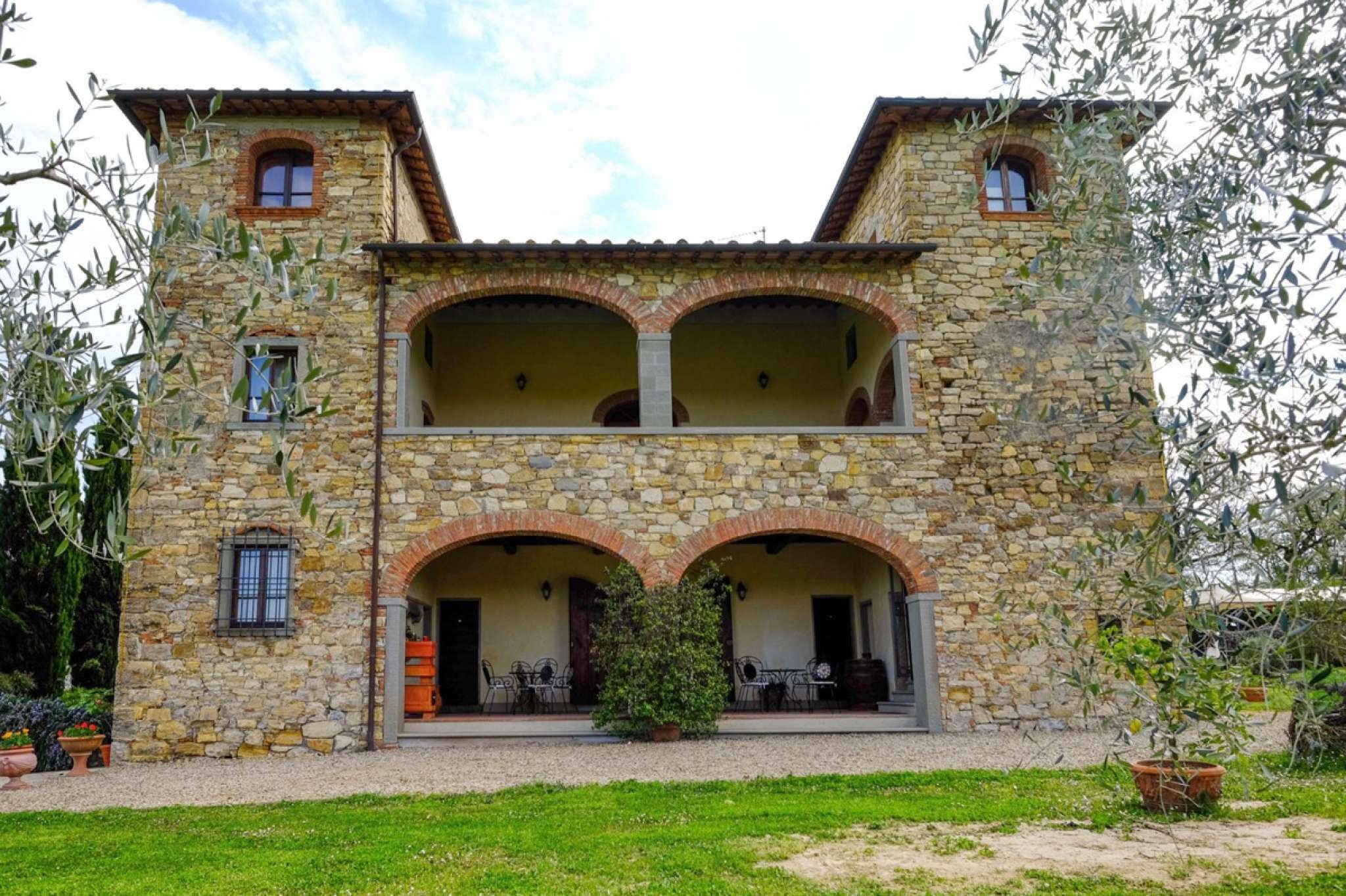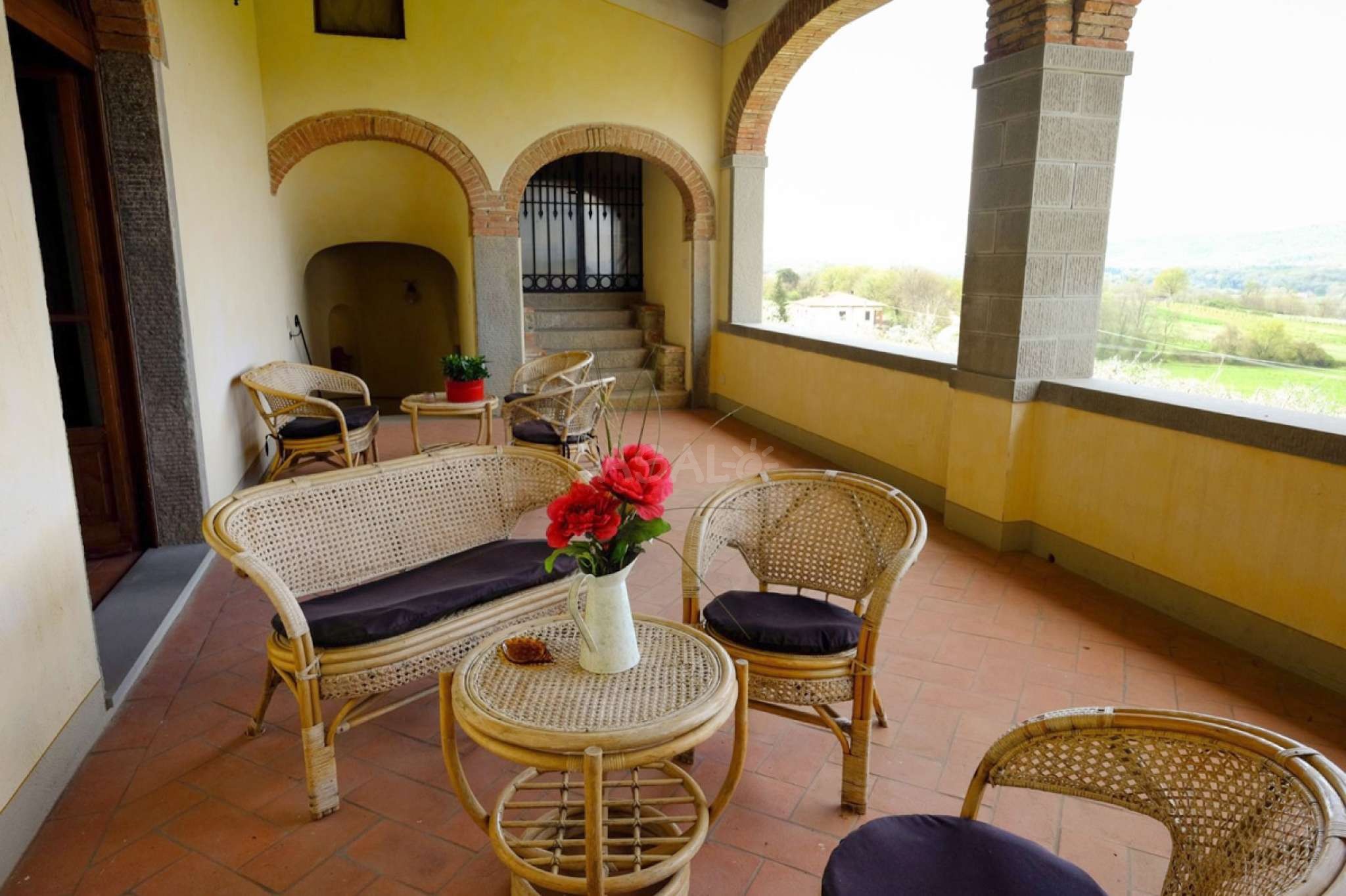In dem gepflegten, komplett eingezäunten Garten befinden sich ein privater Pool mit Dusche, ein Grill, sowie ein überdachter Freisitz für lauschige Abendessen im Freien. Das Landgut bietet eine große Loggia im Erdgeschoss und eine zweite Loggia im ersten Stock mit fantastischem Panoramablick auf die umliegenden Wälder, das Dorf Bucine mit den ersten Hügeln des Chianti Gebiets am Horizont.