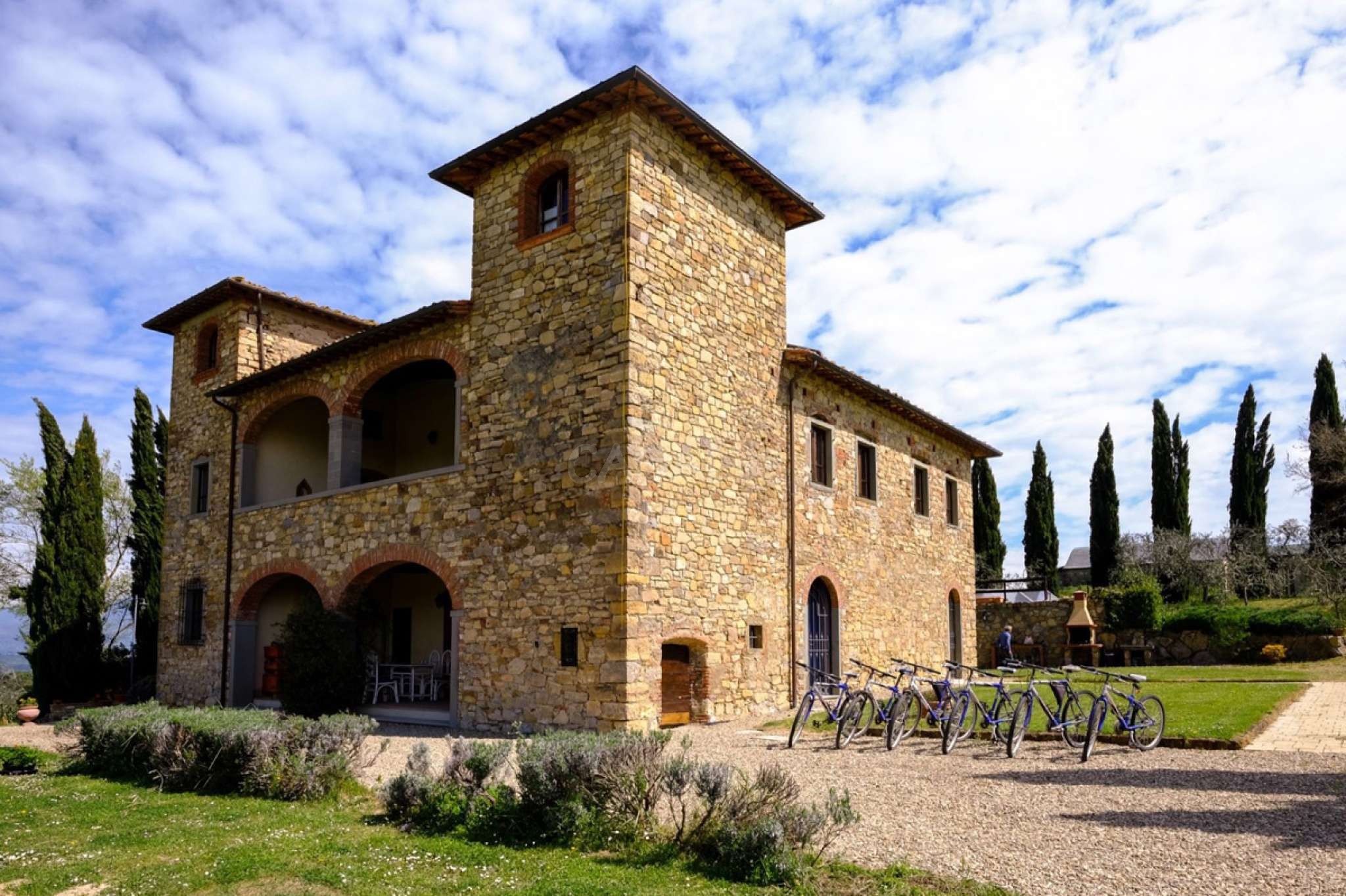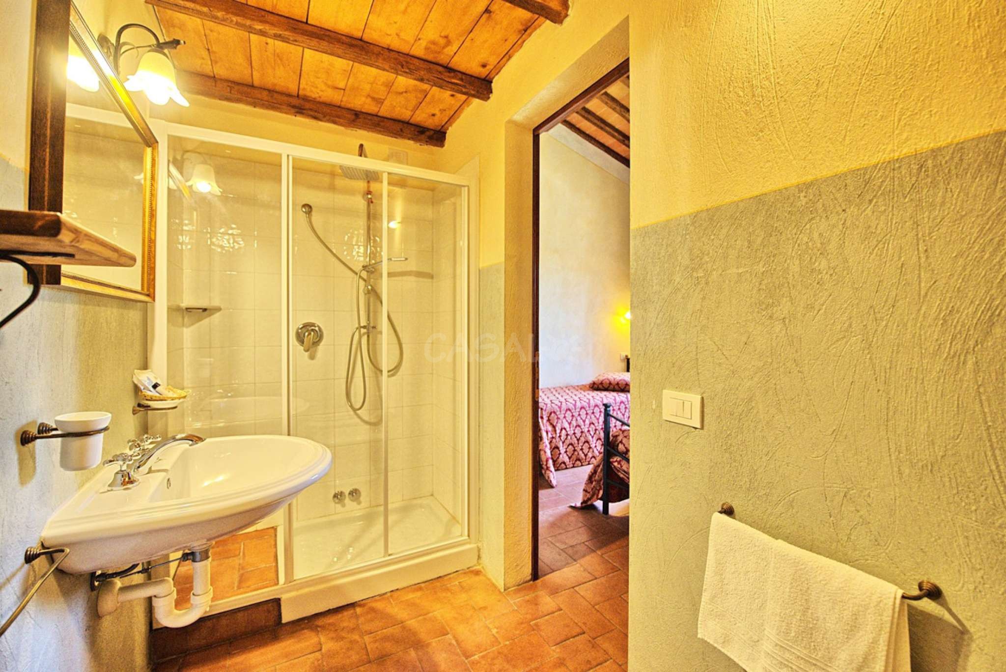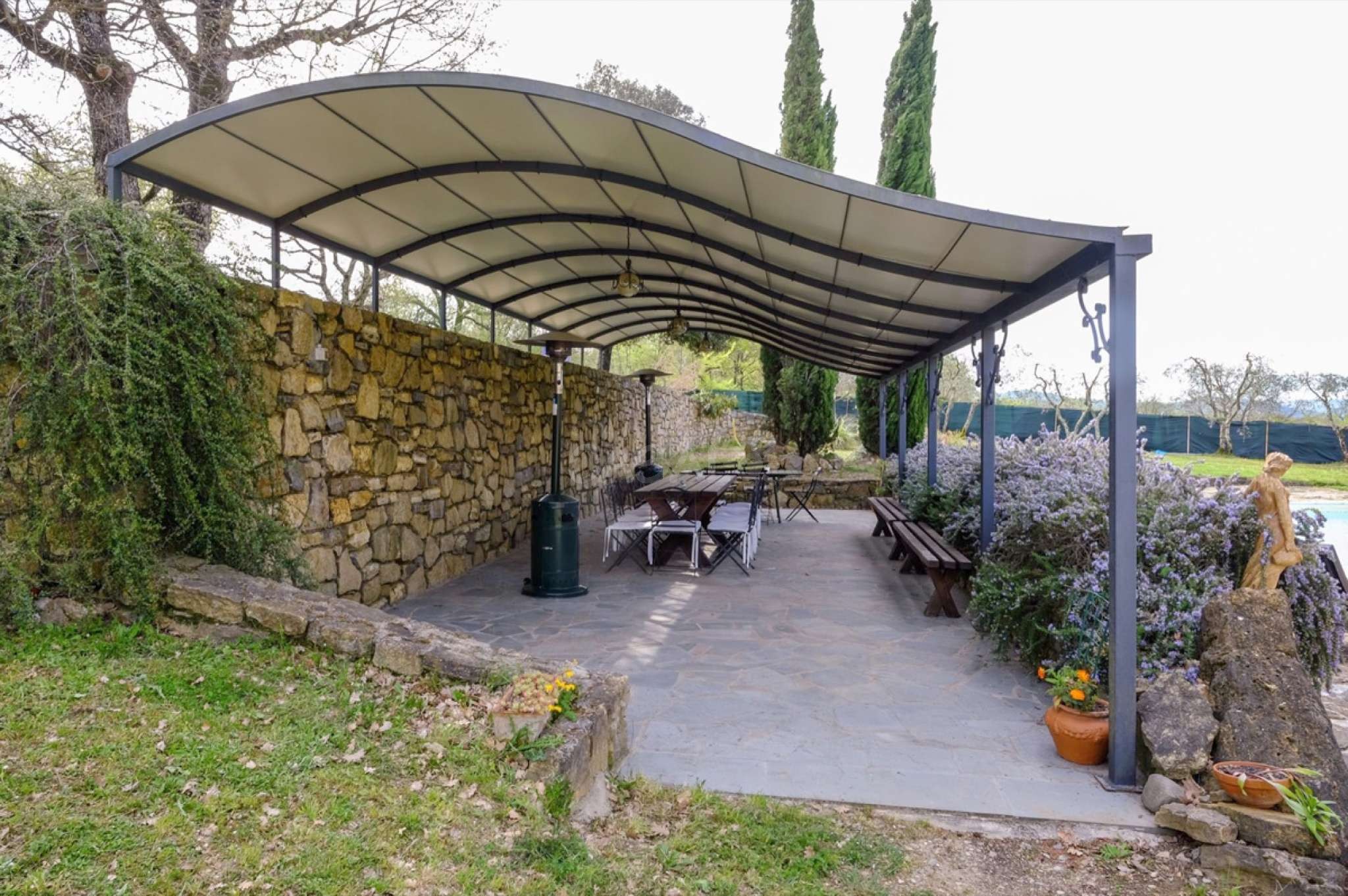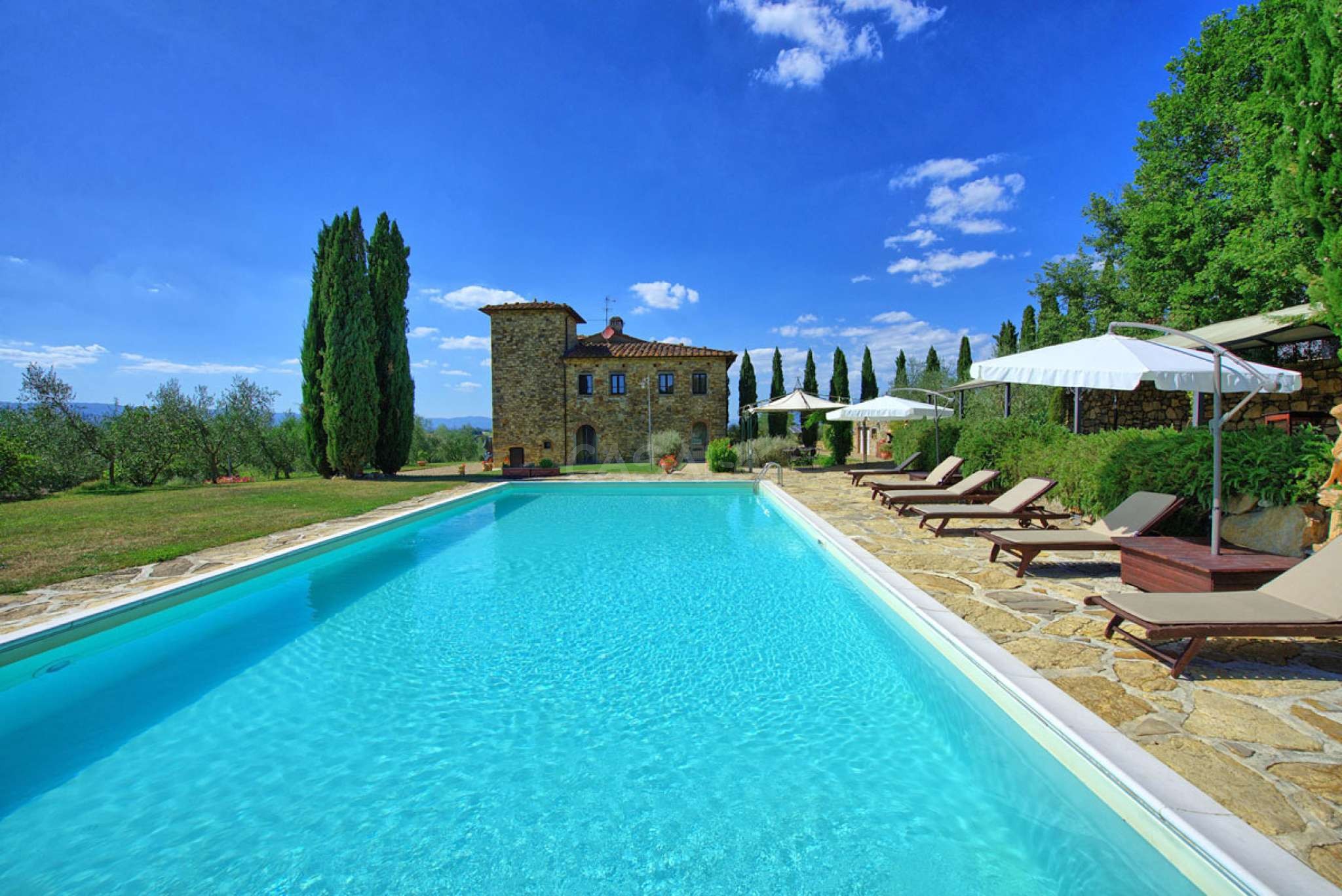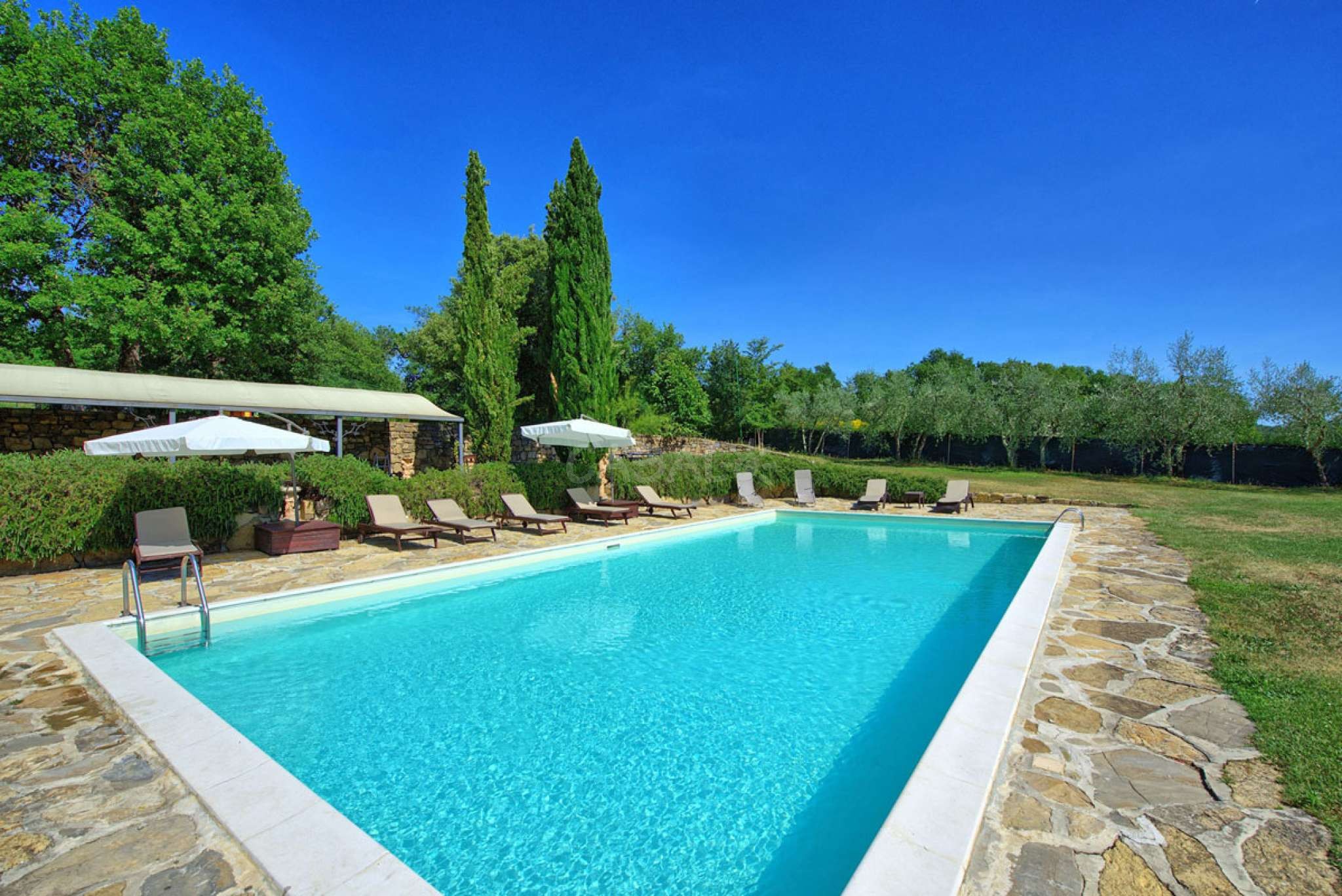 In dem gepflegten, komplett eingezäunten Garten befinden sich ein privater Pool mit Dusche, ein Grill, sowie ein überdachter Freisitz für lauschige Abendessen im Freien. Das Landgut bietet eine große Loggia im Erdgeschoss und eine zweite Loggia im ersten Stock mit fantastischem Panoramablick auf die umliegenden Wälder, das Dorf Bucine mit den ersten Hügeln des Chianti Gebiets am Horizont.