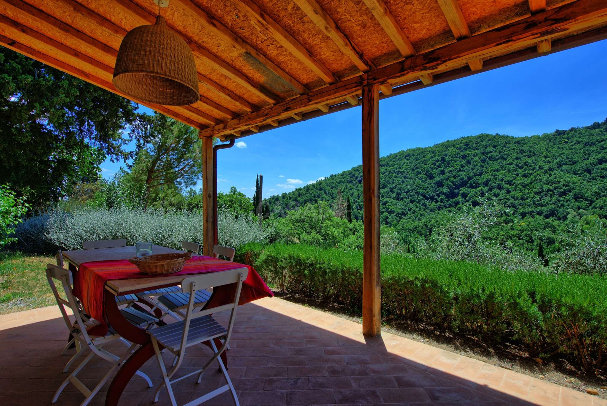 Schön ausgestattete Veranda mit Panorama-Blick auf das Schloss Castello di Fighine.