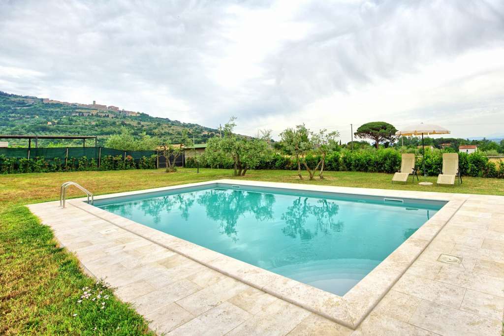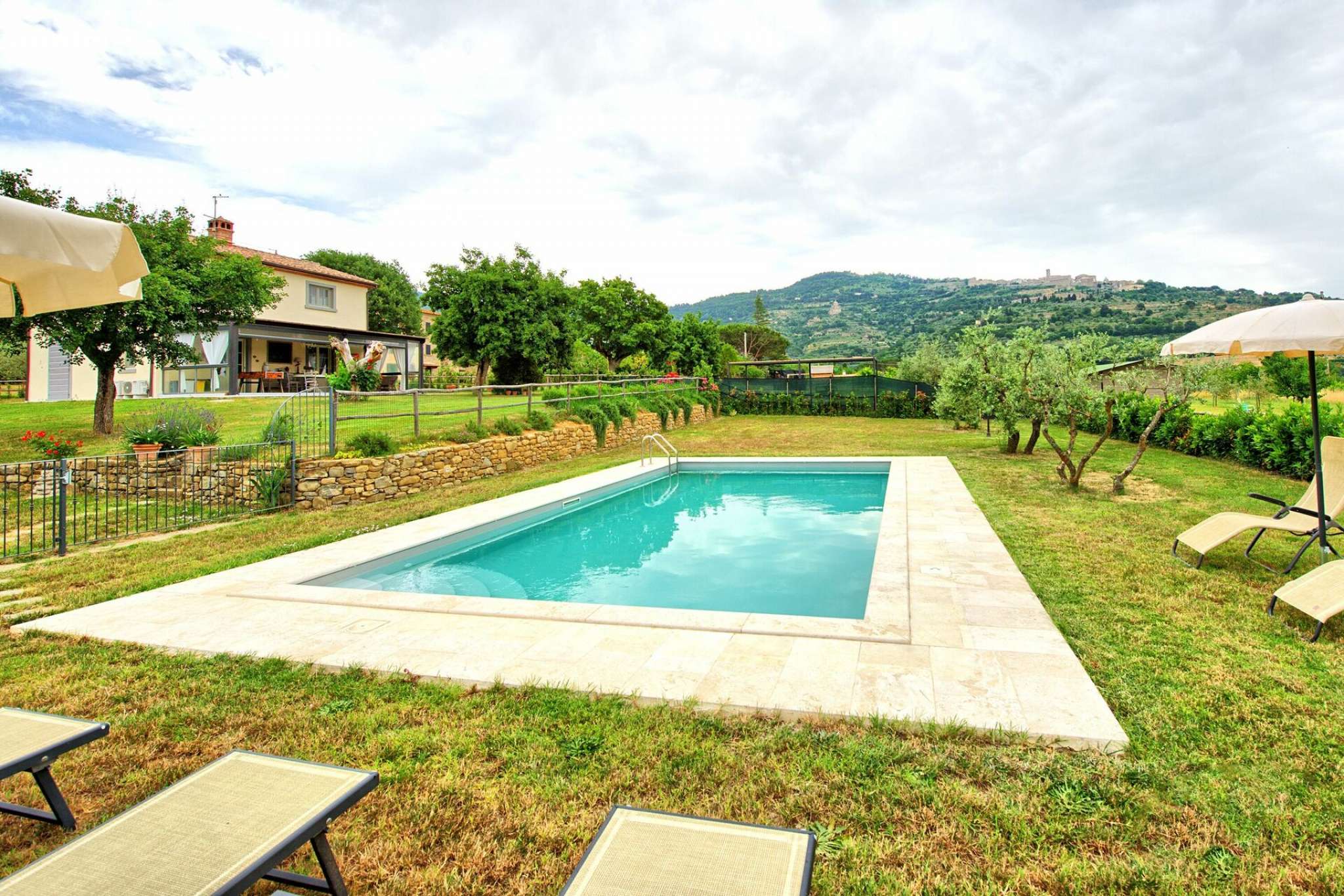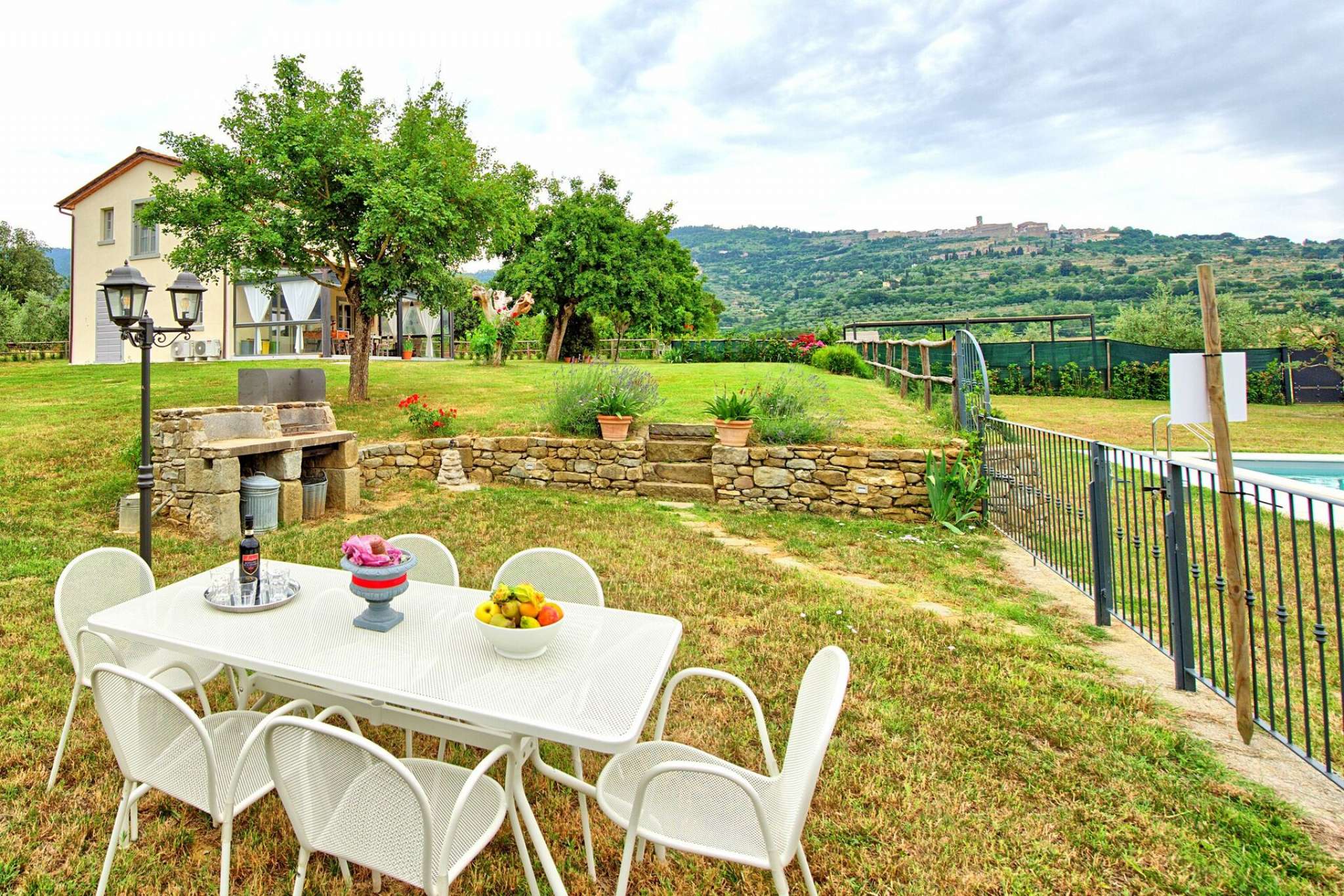 privater Garten, privater Pool, Außendusche, Klimaanlage in den 2 Schlafzimmern im Obergeschoss, überdachte Veranda mit offenen und geschlossenen Wänden, Tischfußball und Tischtennisplatte, Wi-Fi-Internetverbindung, gemauerter Grill, Panoramablick auf die Landschaft und Cortona, Parkplatz, zwei der Doppelbetten können in Einzelbetten aufgeteilt werden (zum Zeitpunkt der Buchung oder eine Woche vor Anreise anzufordern).