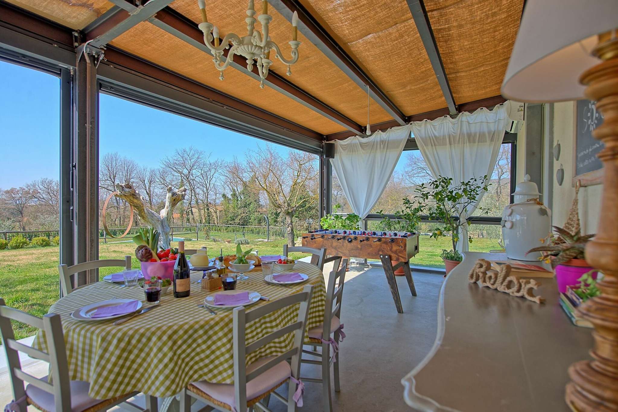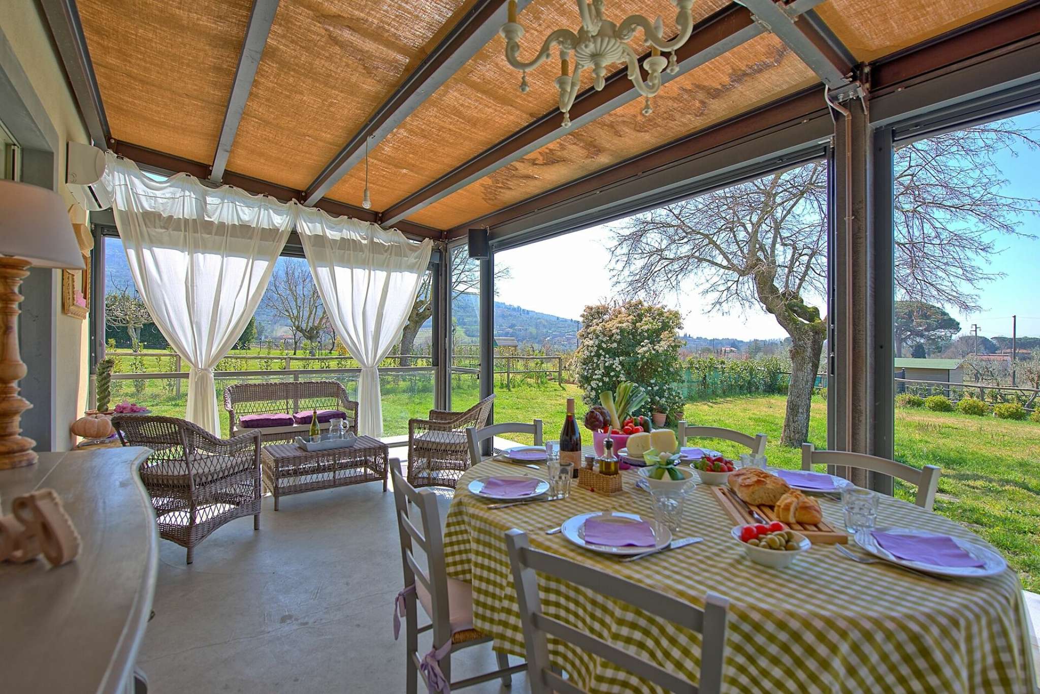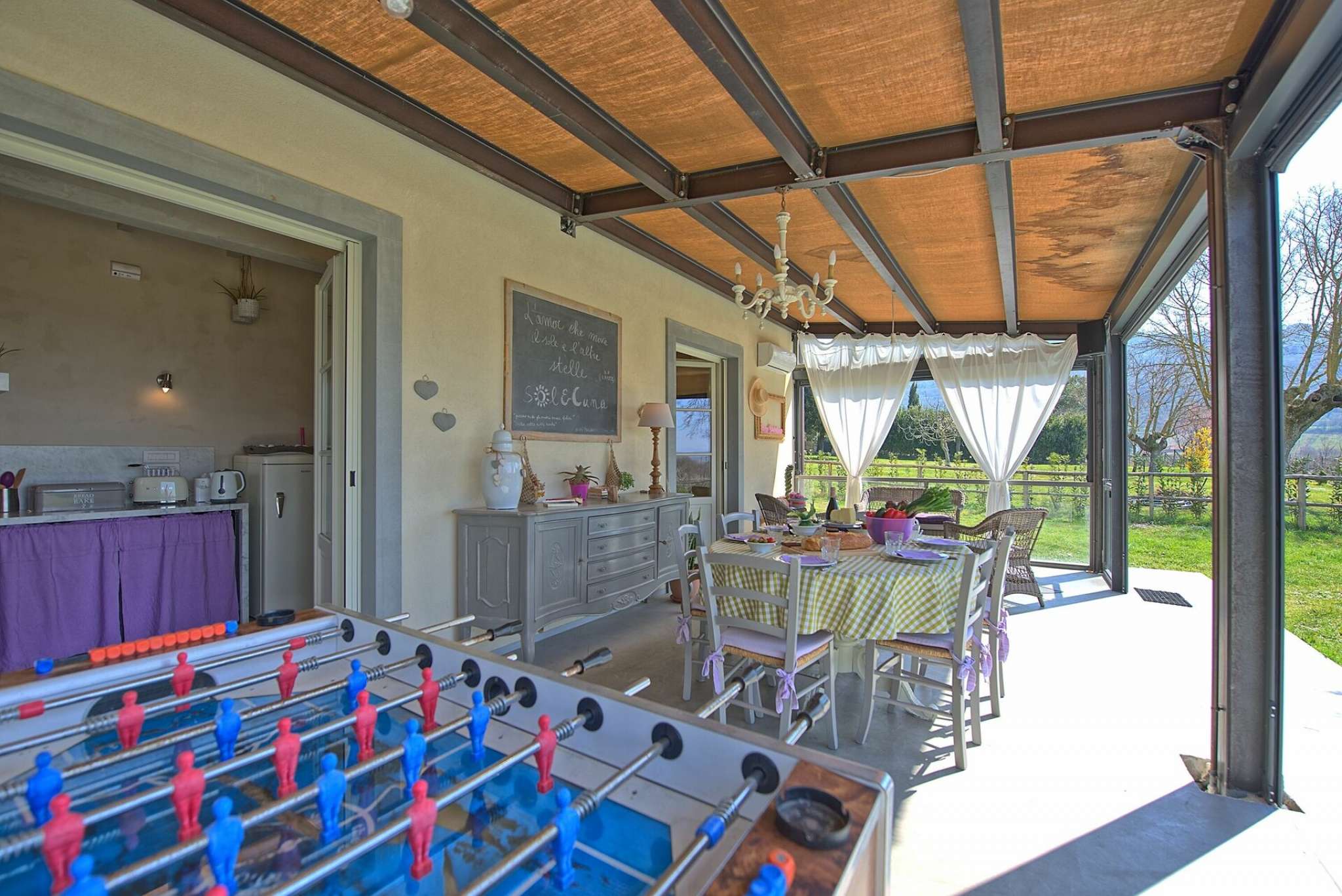 privater Garten, privater Pool, Außendusche, Klimaanlage in den 2 Schlafzimmern im Obergeschoss, überdachte Veranda mit offenen und geschlossenen Wänden, Tischfußball und Tischtennisplatte, Wi-Fi-Internetverbindung, gemauerter Grill, Panoramablick auf die Landschaft und Cortona, Parkplatz, zwei der Doppelbetten können in Einzelbetten aufgeteilt werden (zum Zeitpunkt der Buchung oder eine Woche vor Anreise anzufordern).