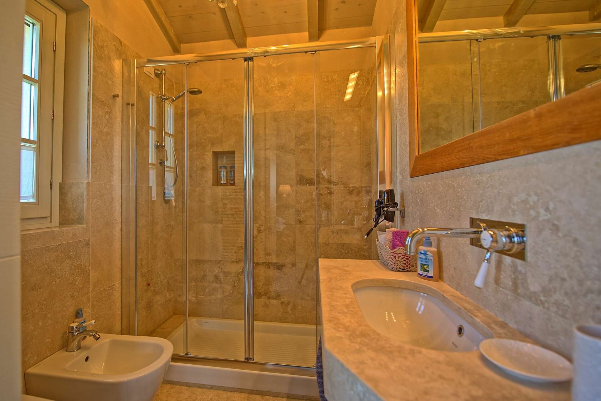 Erdgeschoss: Eingang zum hellen Wohnzimmer (TV) mit Kamin (nicht mehr in Funktion) und Essbereich, Küche (kleiner elektrischer Backofen, Geschirrspüler, Kühlschrank mit kleiner Gefriertruhe), große überdachte Veranda mit Essbereich, Sofas und Tischfußball, Arbeitszimmer mit Bad mit Dusche (ohne Bidet), Doppelzimmer mit eigenem Bad mit Dusche (ohne Bidet) und Zugang zum Garten.